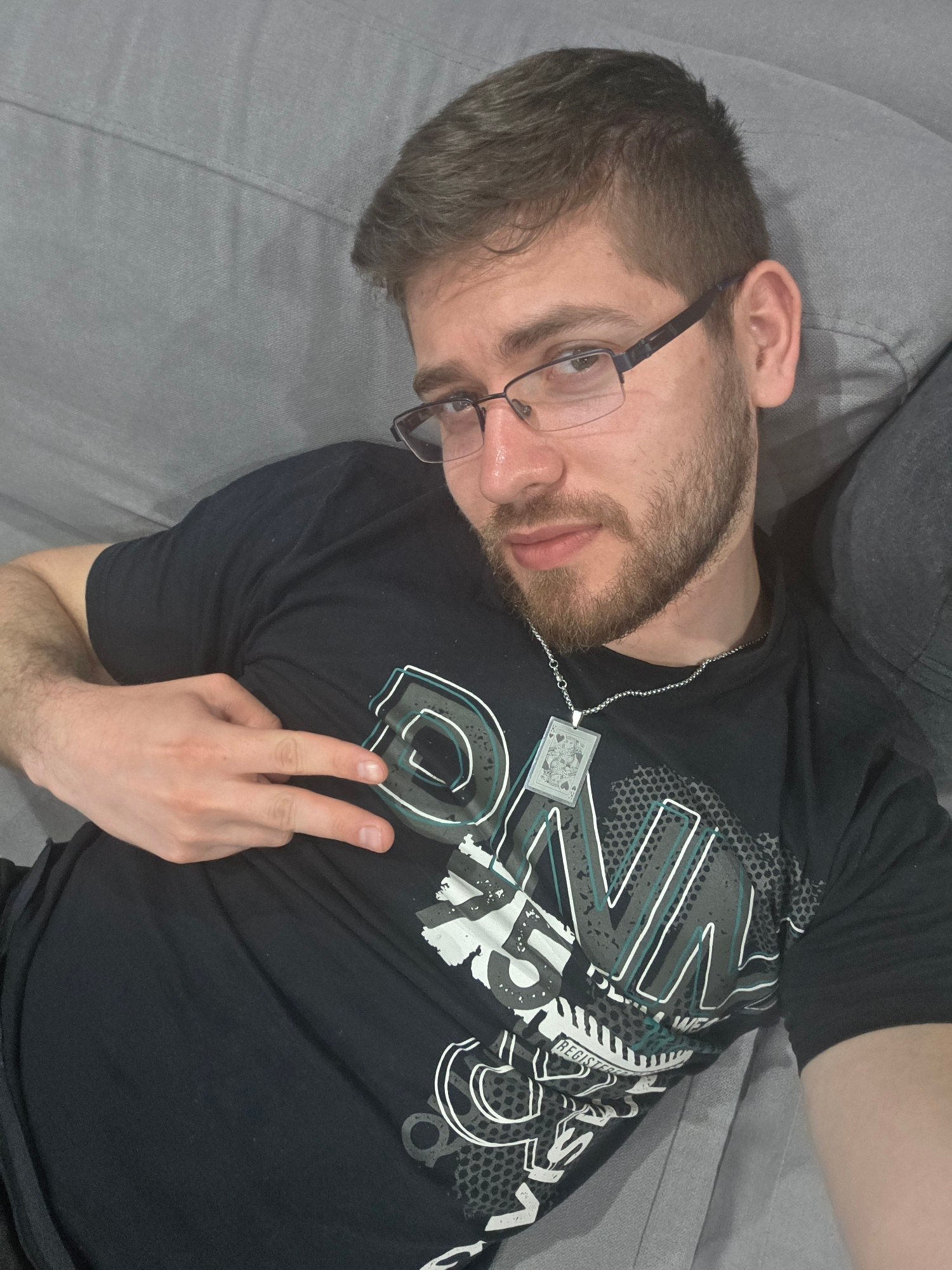A man is lying on a grey sofa, facing upwards. He is wearing glasses and a black t-shirt with a white and grey graphic design and a playing card pendant. He is making a peace sign with his right hand.…read more