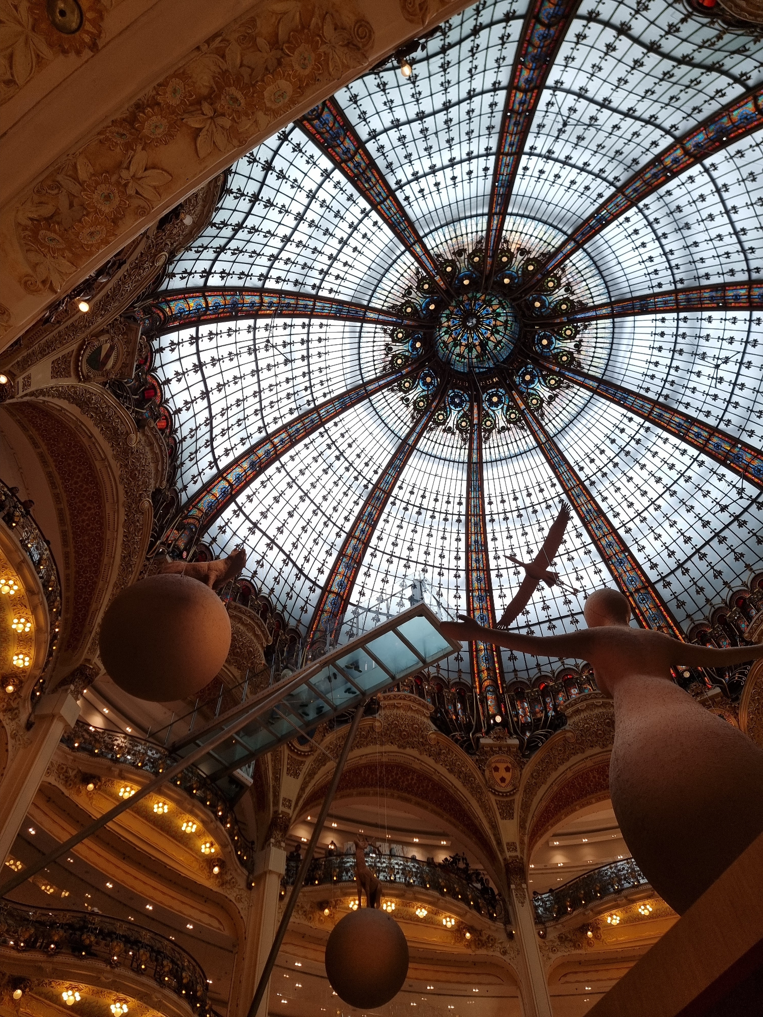 The image depicts the interior of Galeries Lafayette Haussmann in Paris, France, specifically the stained-glass dome. The dome is intricate with geometric patterns and vibrant colors. Underneath the d…read more