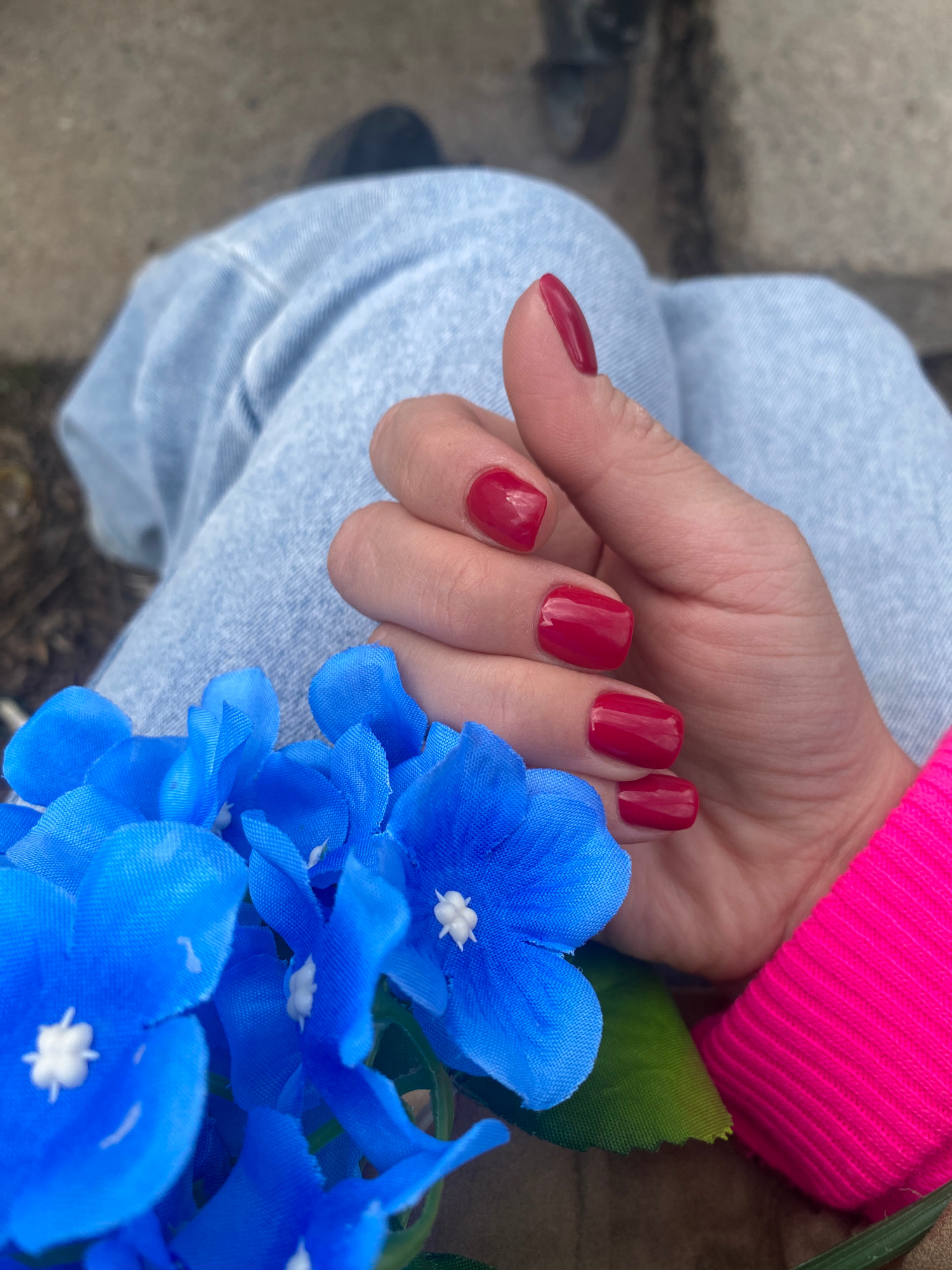 A hand with red nail polish is positioned next to a bouquet of artificial blue flowers with white centers. The hand rests on a pair of light blue denim pants. A bright pink sweater sleeve is partially…read more