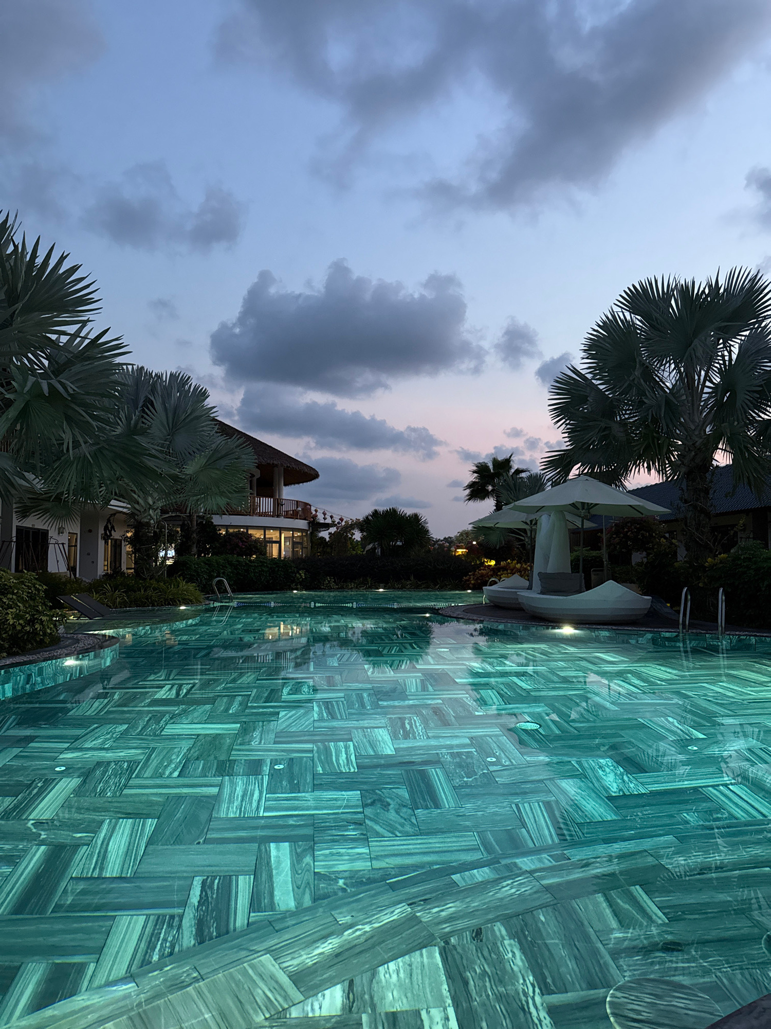 The media file captures a serene resort scene at dusk, likely in Phú Quốc, Vietnam. The primary subject is a large swimming pool that stretches across the right side of the image, illuminated by subme…read more