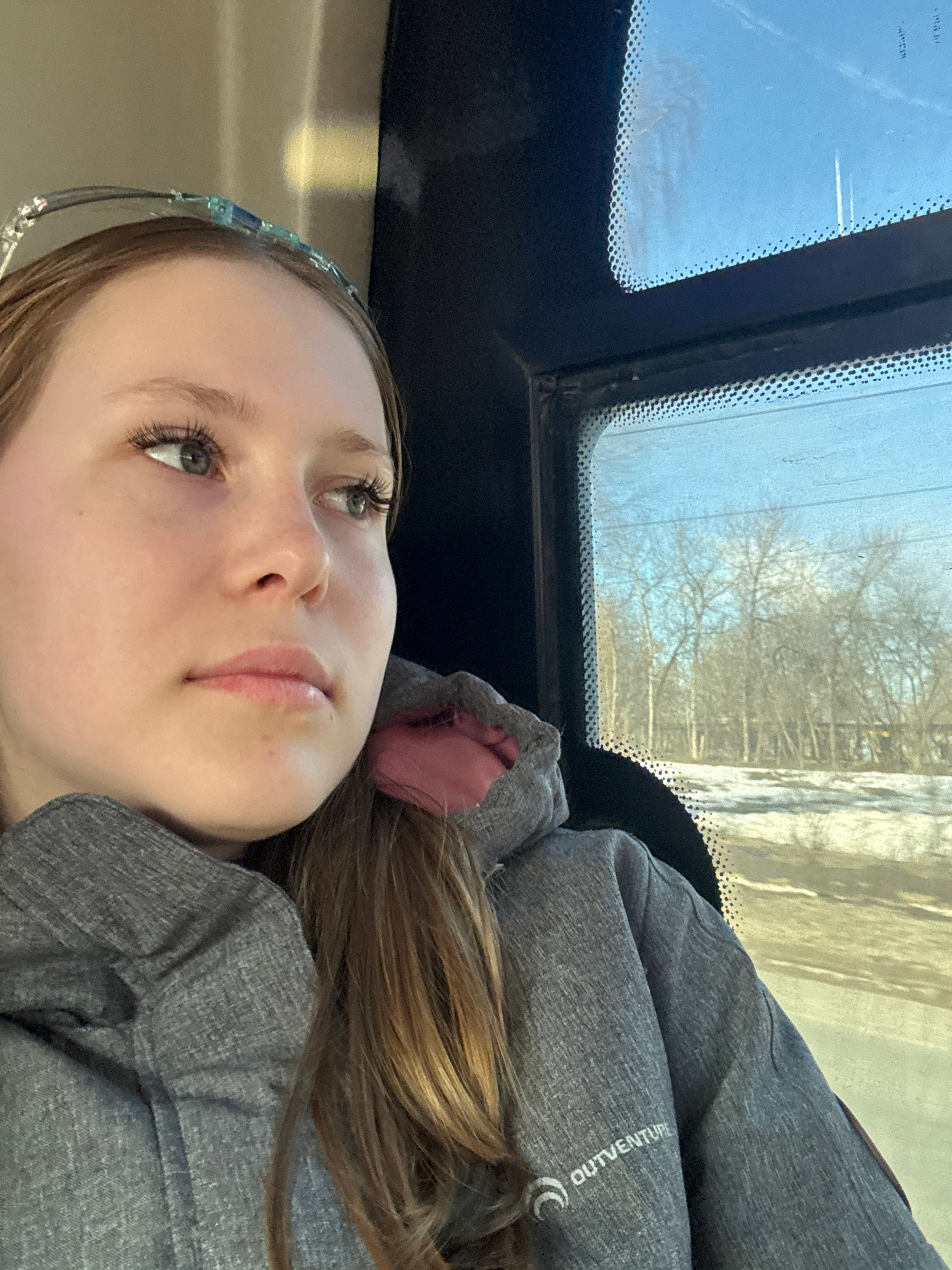 A close-up shot depicts a young woman with light skin and green eyes, framed by light brown hair. She wears a headband and a gray hooded jacket with the word "OUTVENTURE" printed on the sleeve. The ba…read more