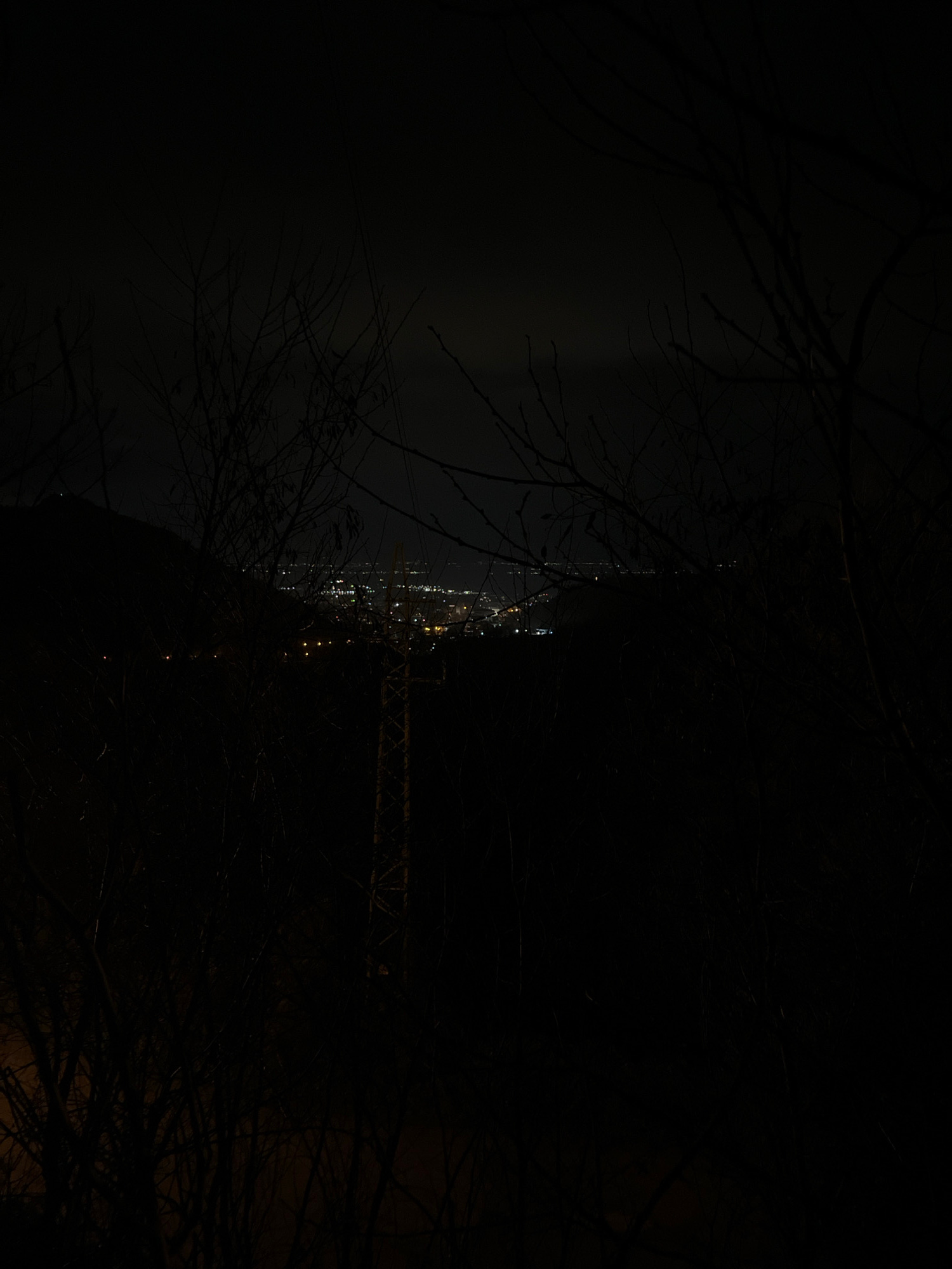 The image depicts a nighttime scene in an urban environment. In the background, a tall structure, possibly a building under construction or a skyscraper, is visible through a hazy or foggy atmosphere.…read more