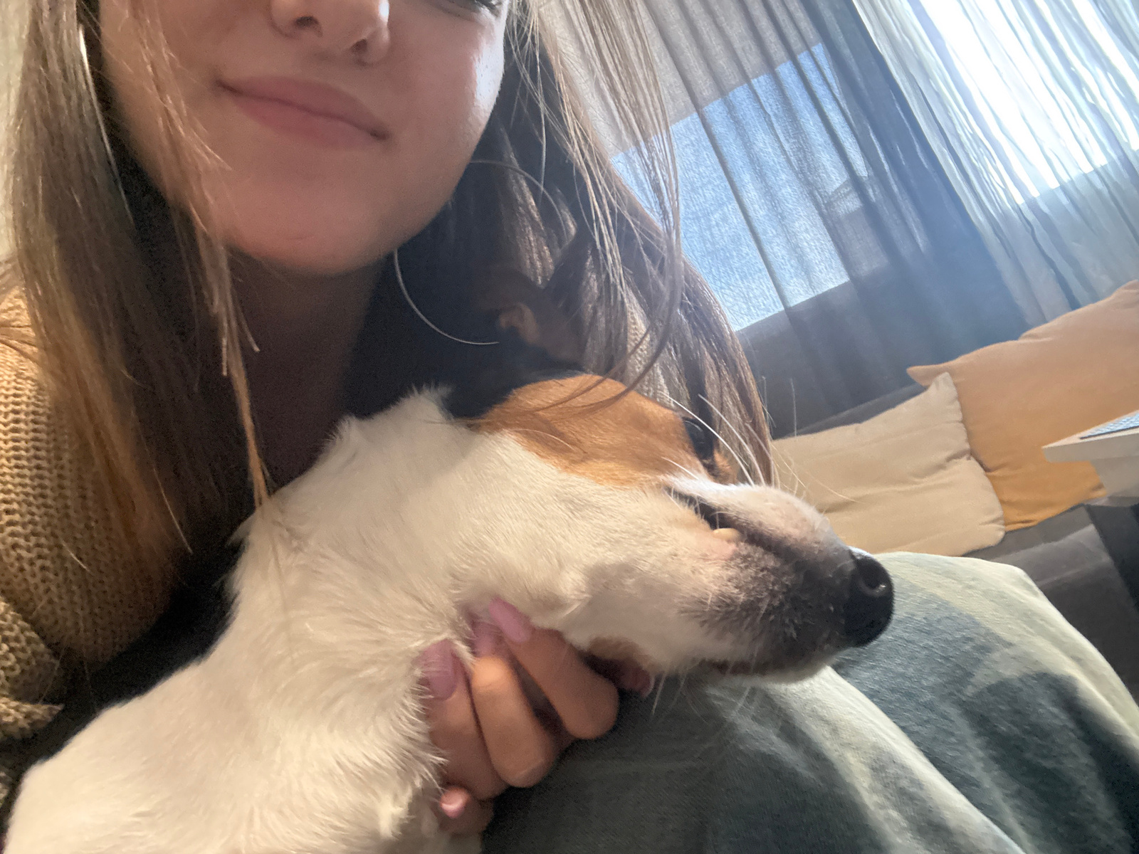 The image shows a person with long brown hair and light skin. They are wearing a gold earring. A dog with white and brown fur is positioned on top of the person. The person's hand with light pink nail…read more
