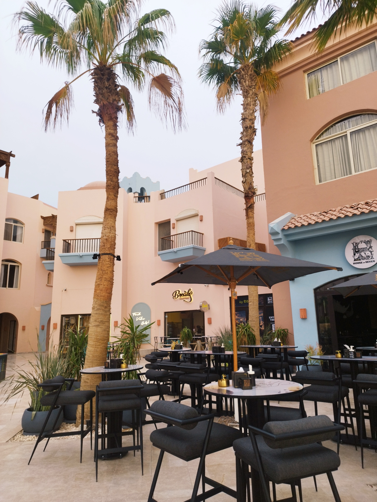 This image shows an outdoor café or restaurant in Ras Abu Soma, Egypt, under an overcast sky. The space is furnished with numerous small, round tables and matching dark-colored high chairs. Several ta…read more