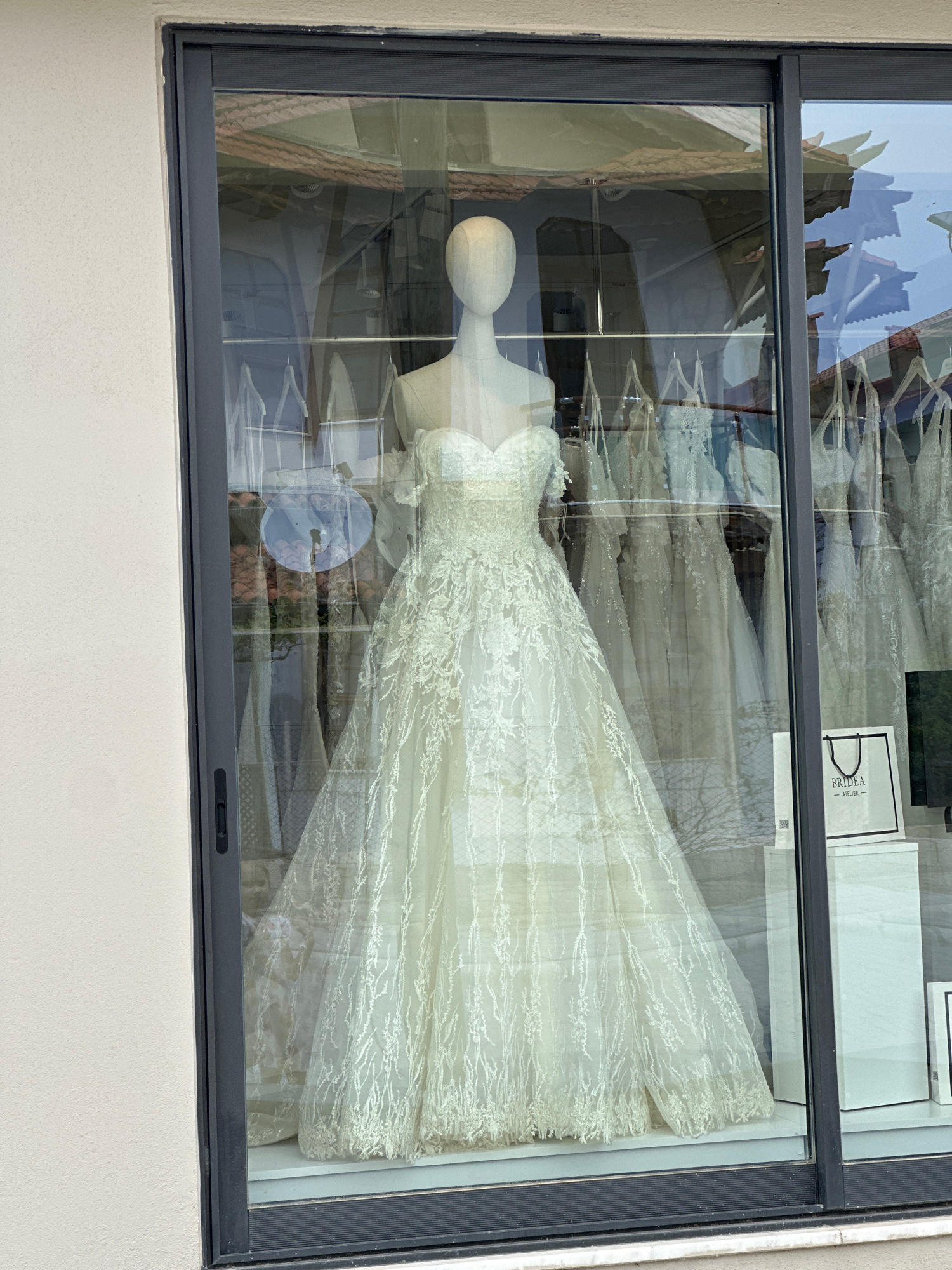 A wedding dress is displayed on a mannequin in the window of a Bridea Atelier store. The window's reflection reveals buildings and the sky above. The store is likely located in Fethiye, Turkey, given…read more