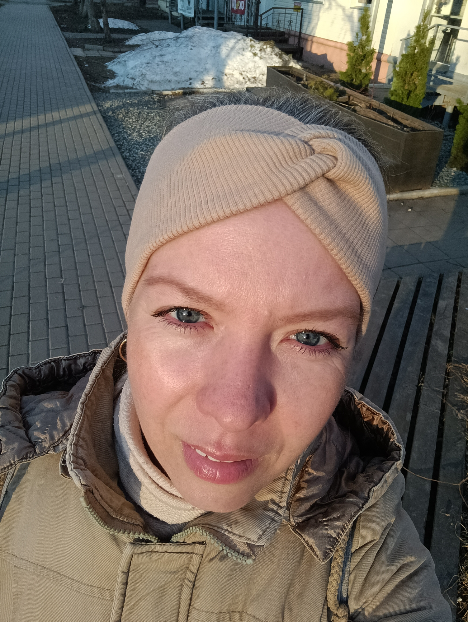 A high-angle selfie captures a woman outdoors in an urban or suburban setting, likely during late winter or early spring in Chaikovsky, Russia. She is the central subject, looking directly at the came…read more