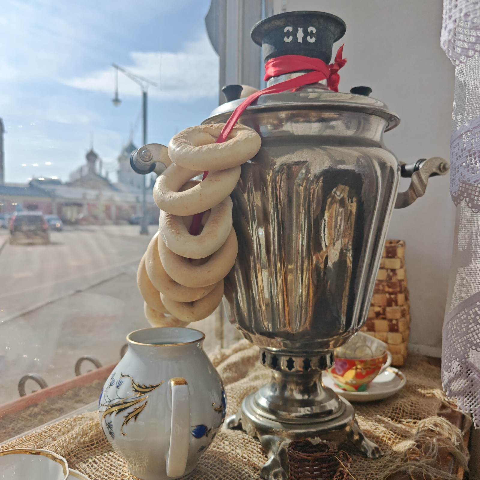 A medium indoor shot shows a samovar with a string of bagels hanging from it, displayed on a counter in front of a window overlooking a street scene in Rostov, Russia. The samovar, made of shiny metaβ¦read more