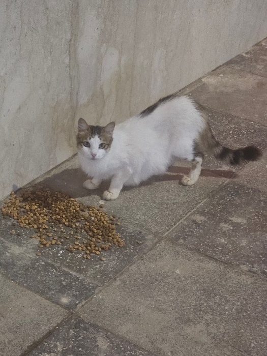 A white and tabby cat lies on a tiled surface, looking up at the camera. A pile of dry cat food is scattered on the adjacent tile. The cat's body is angled, with its head close to the food and its tai…read more