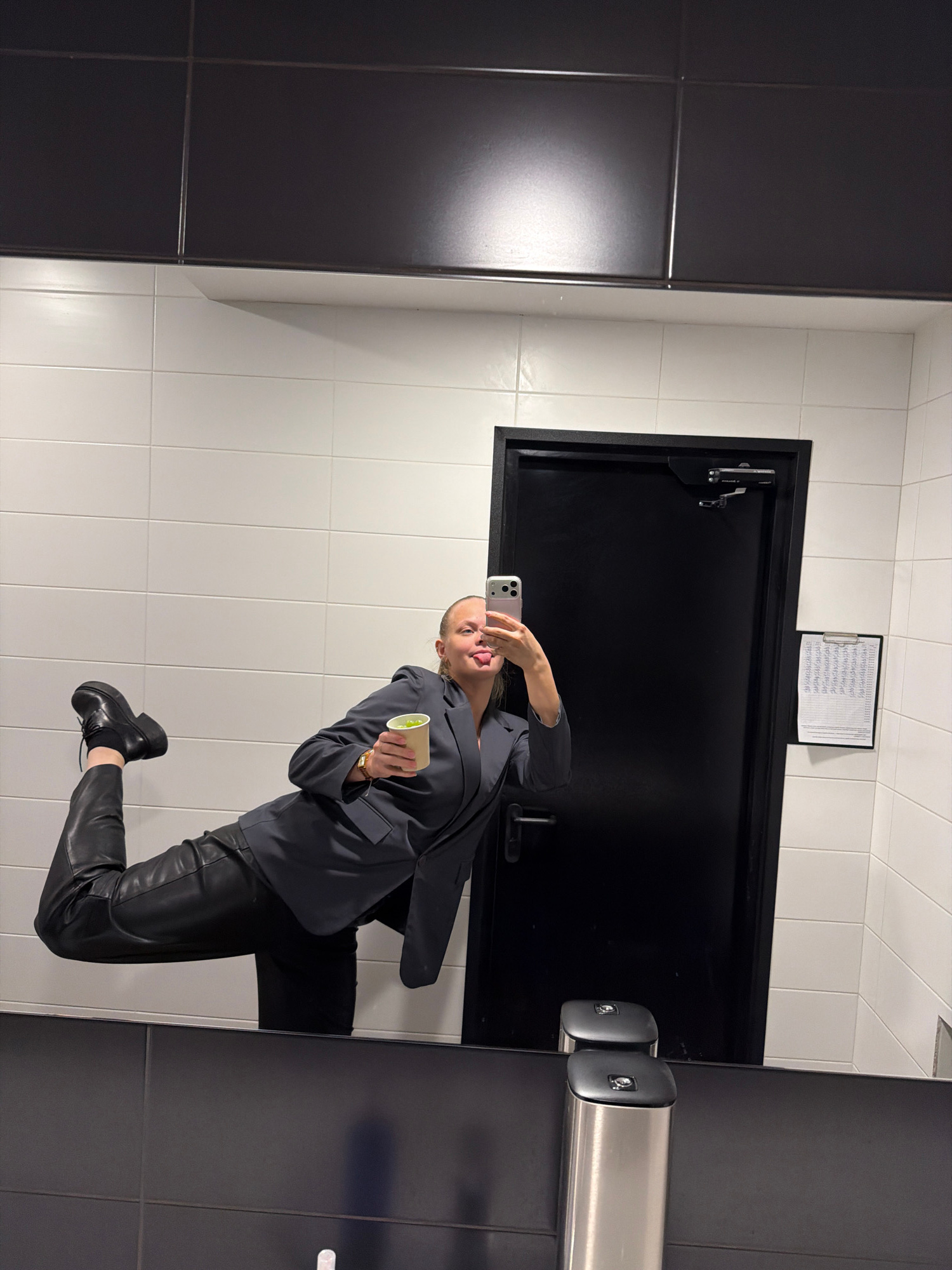 A person is visible, taking a selfie in a bathroom. The person is wearing a dark grey blazer, black leather pants, and black boots. They are holding a cup in their left hand and a phone in their rightβ¦read more