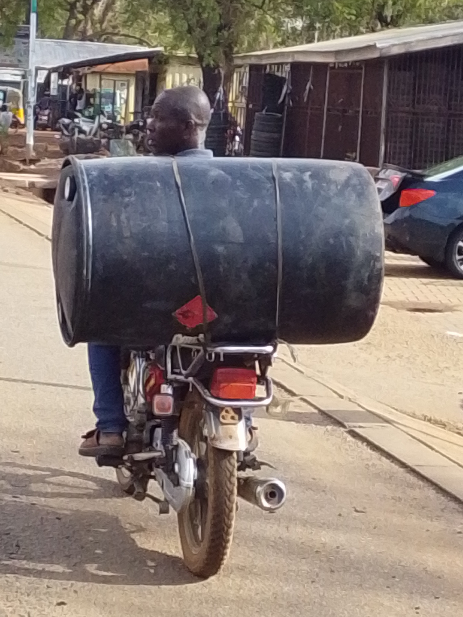 The image captures a man on a motorcycle transporting a large, black barrel in Tamale, Ghana. The barrel is strapped to the back of the motorcycle, almost obscuring the vehicle itself. The man is wear…read more