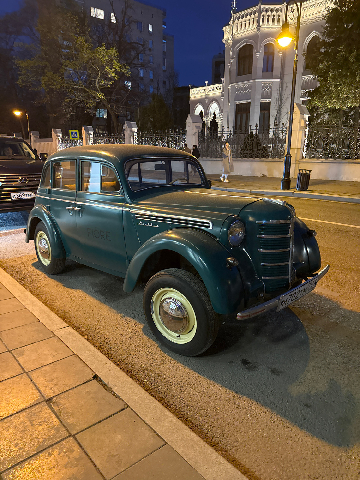 At night, a green vintage car with a white-walled tire is parked on the street in Moscow, Russia. It appears to be a Moskvich 400. The license plate on the car is A369TM 799. In the background, there…read more