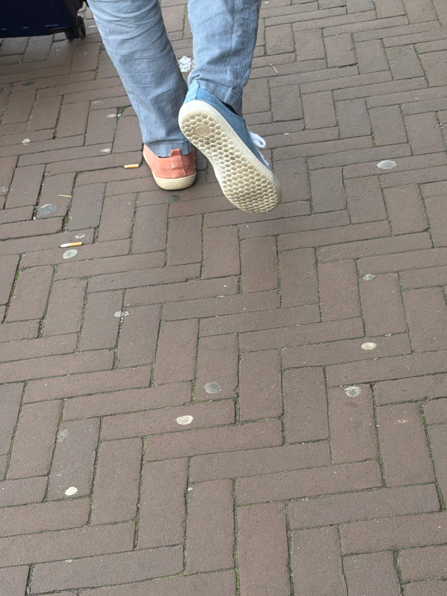 An overhead shot captures a person's lower legs and feet standing on a paved surface, likely a sidewalk or street, in Amsterdam, Netherlands. The pavement consists of reddish-brown rectangular bricks…read more