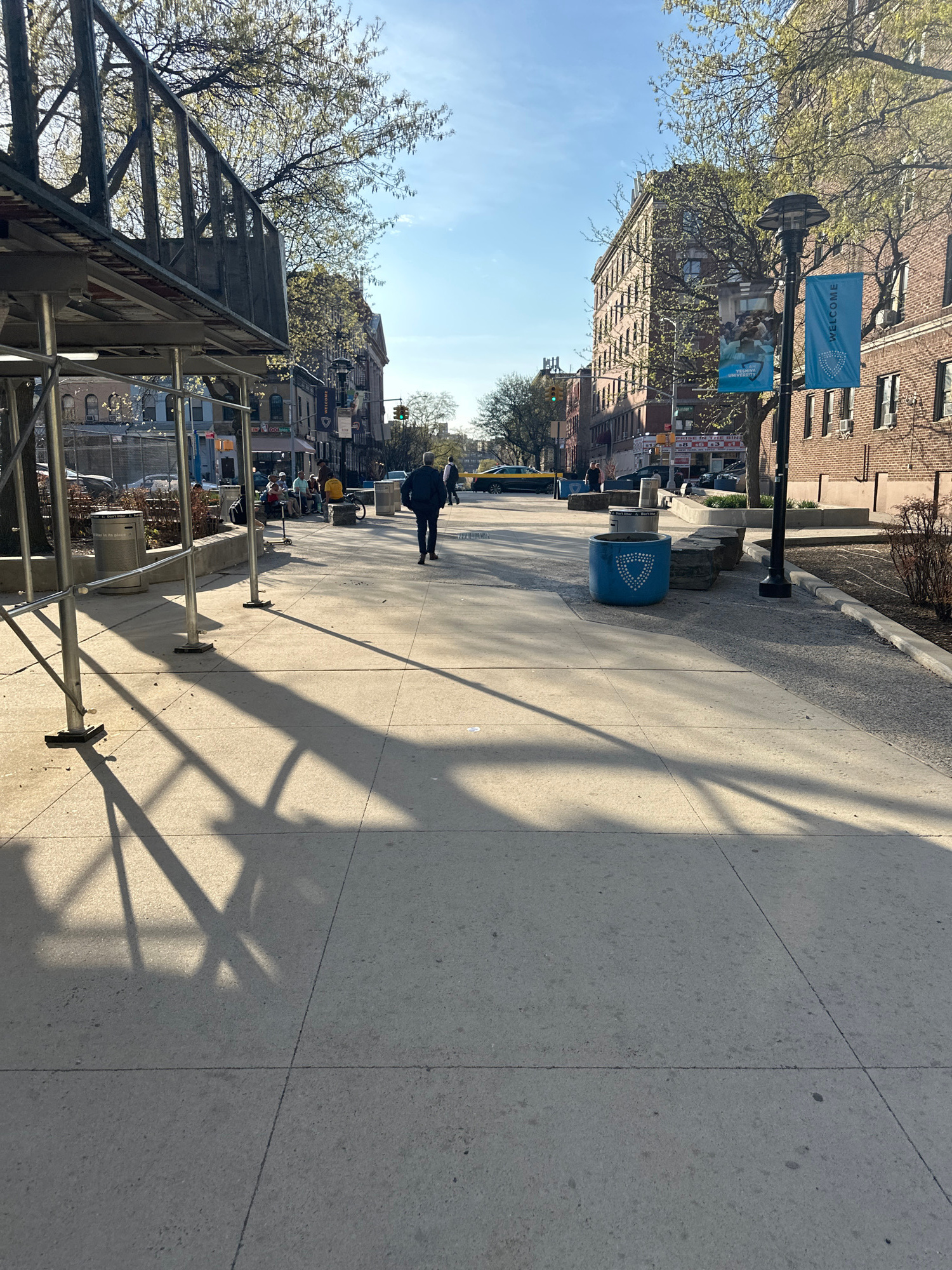 The image depicts a sidewalk scene in what appears to be New York City. The sidewalk is concrete, with visible shadows from a scaffolding structure and trees. A person walks down the sidewalk, heading…read more
