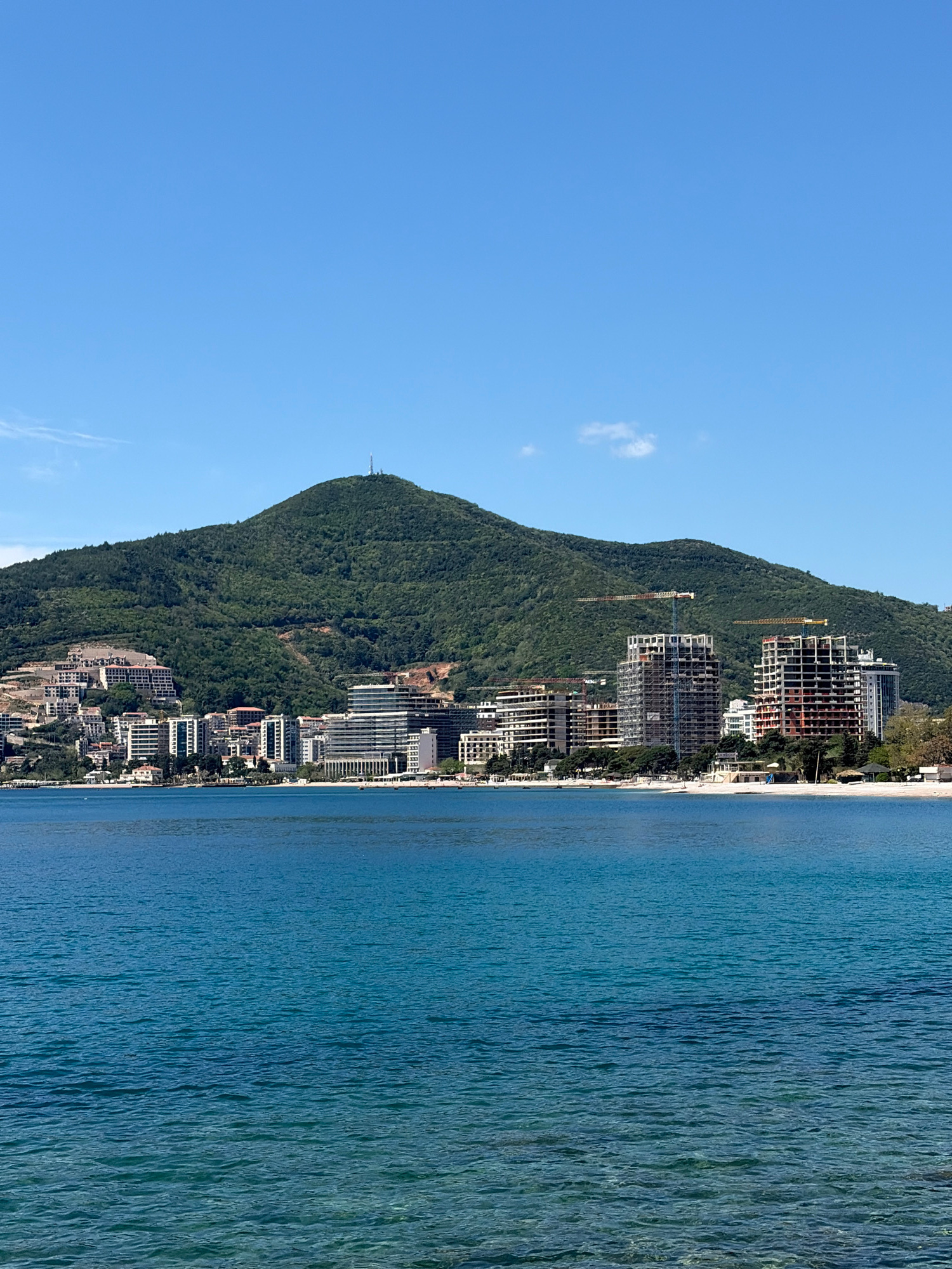 The image depicts a coastal cityscape, likely near Budva, Montenegro. The scene is oriented with the sky on the left, the shoreline in the center, and the sea on the right. A verdant, mountainous hil…read more