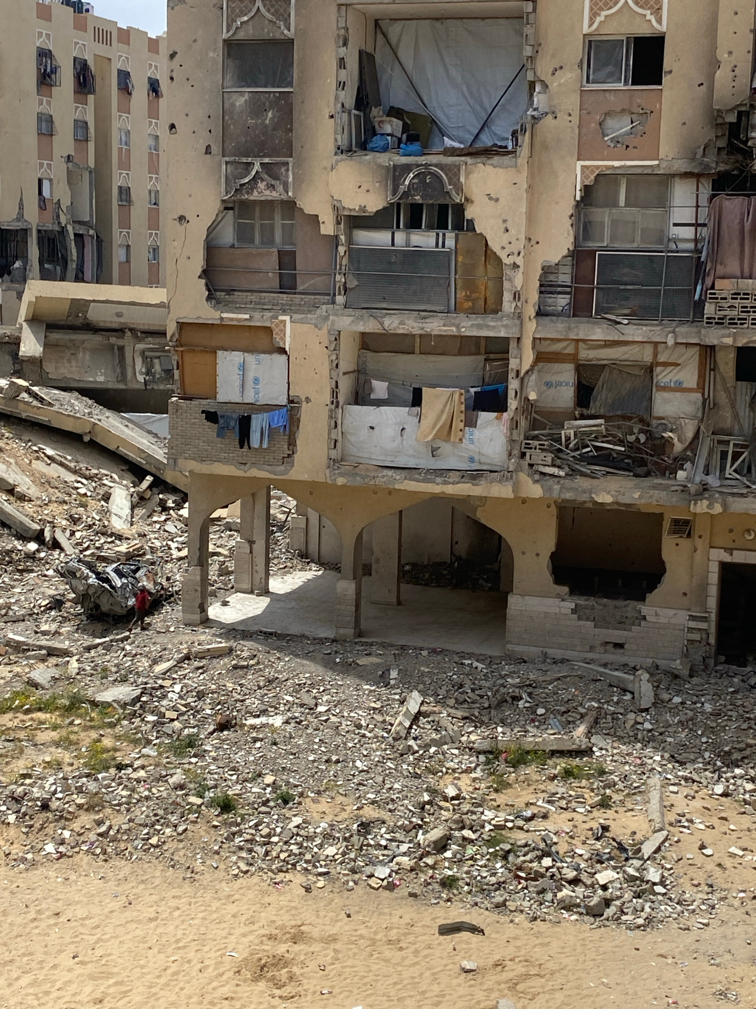 The image depicts the extensive damage to a building in Khan Yunis, Palestinian Territory. The structure is heavily damaged, with large portions missing, exposing the interior. Windows are shattered,…read more