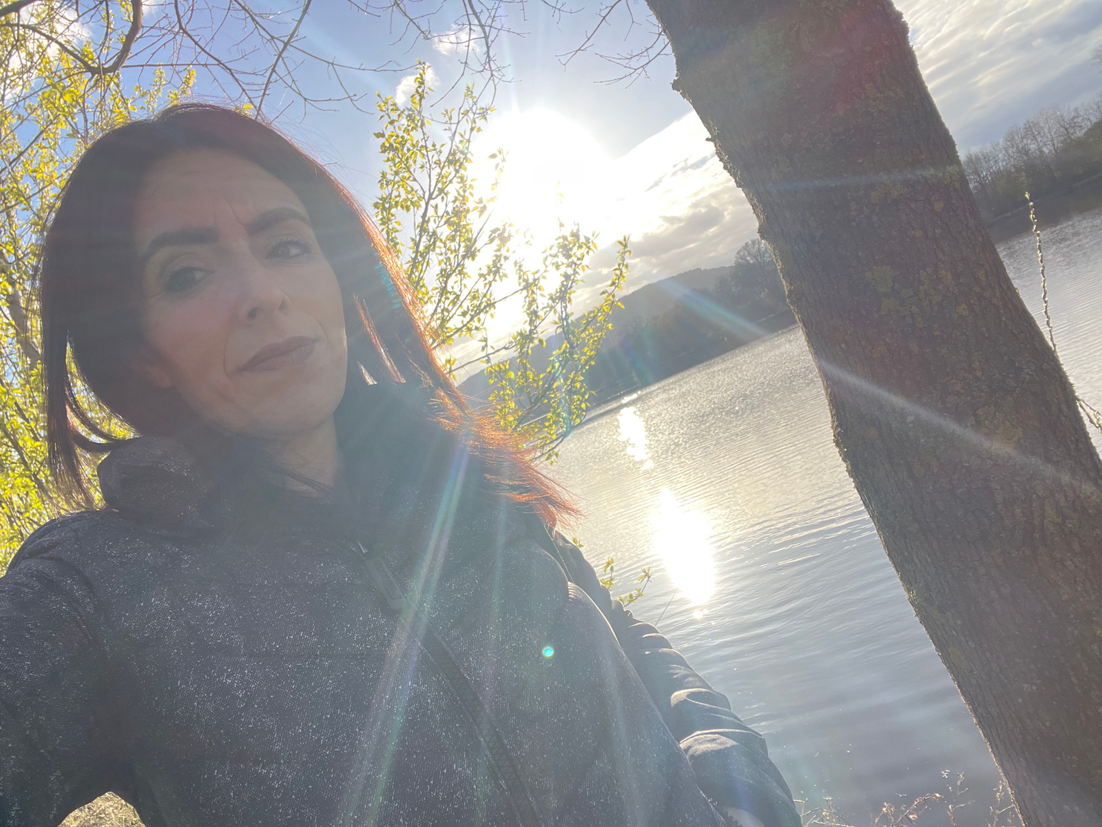 The image presents a selfie-style portrait of a female subject outdoors in Konz, Germany. The woman, with dark reddish-brown hair, is positioned in the left half of the frame, wearing a dark, textured…read more