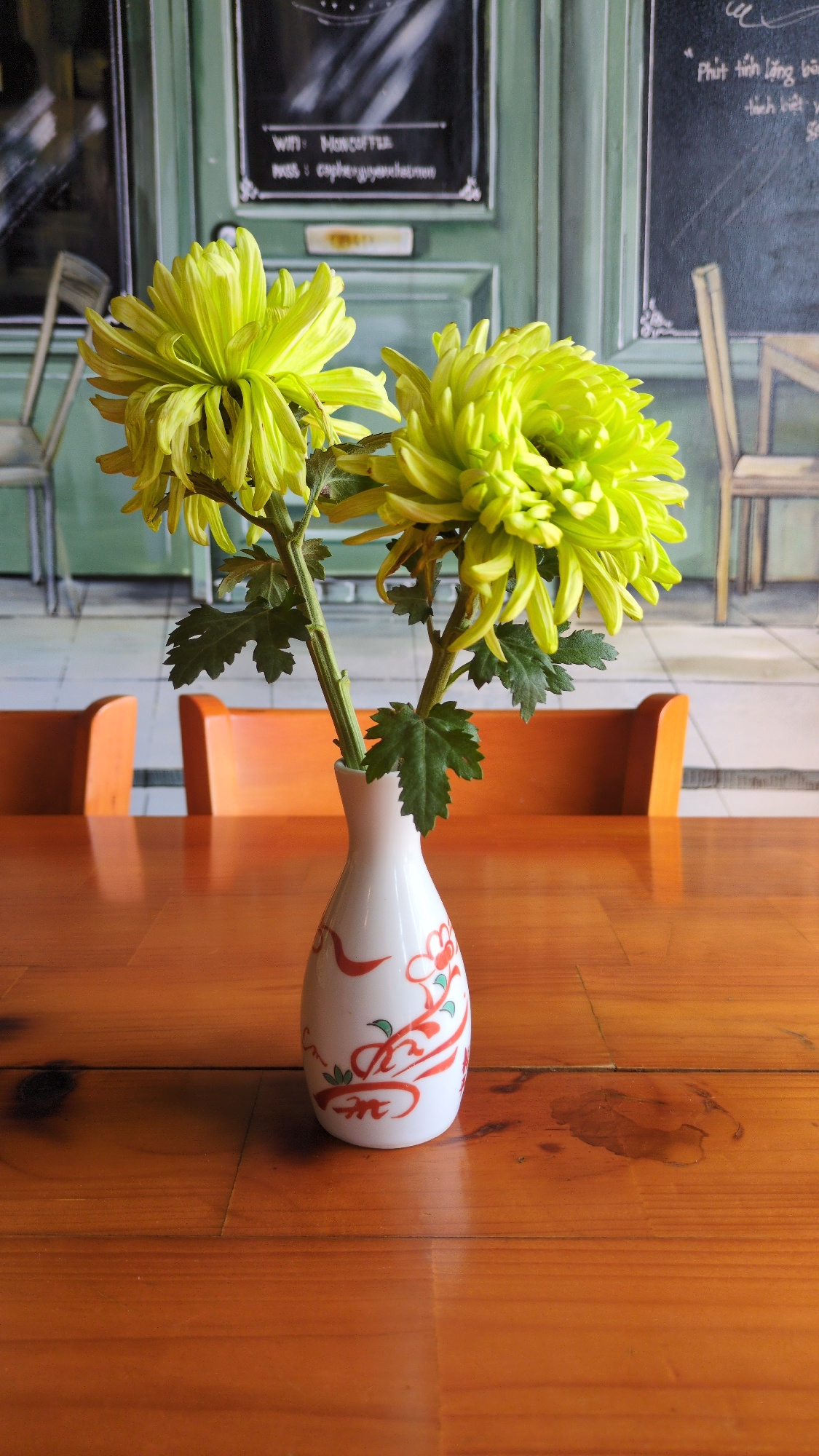 On a wooden table indoors, two yellow chrysanthemum flowers with green leaves sit in a white vase with red floral designs. The vase is horizontal, on its side. Behind the flowers and vase, a tiled wal…read more