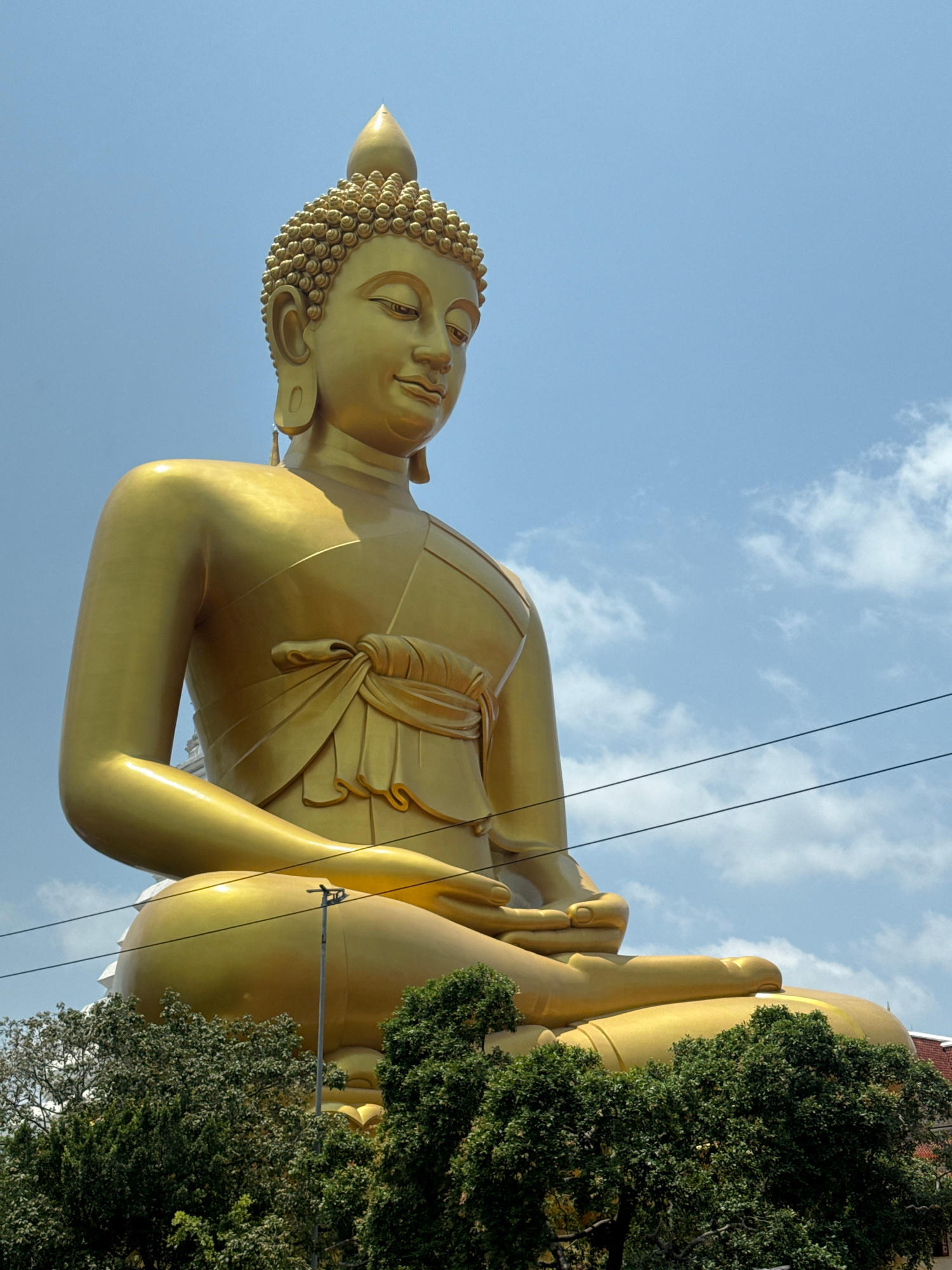 The image captures a low-angle view of a massive, golden reclining Buddha statue against a blue sky with scattered clouds. The statue is highly detailed, with intricate patterns on the head and robes.…read more