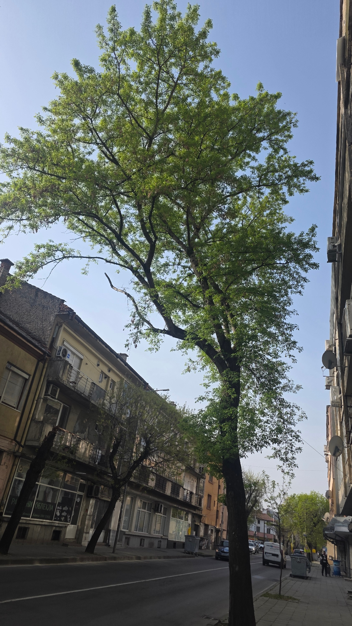 The image depicts a street scene in Blagoevgrad, Bulgaria, characterized by trees lining the sidewalk, buildings, and a clear sky. The main subject is a large, mature tree with green foliage, positio…read more