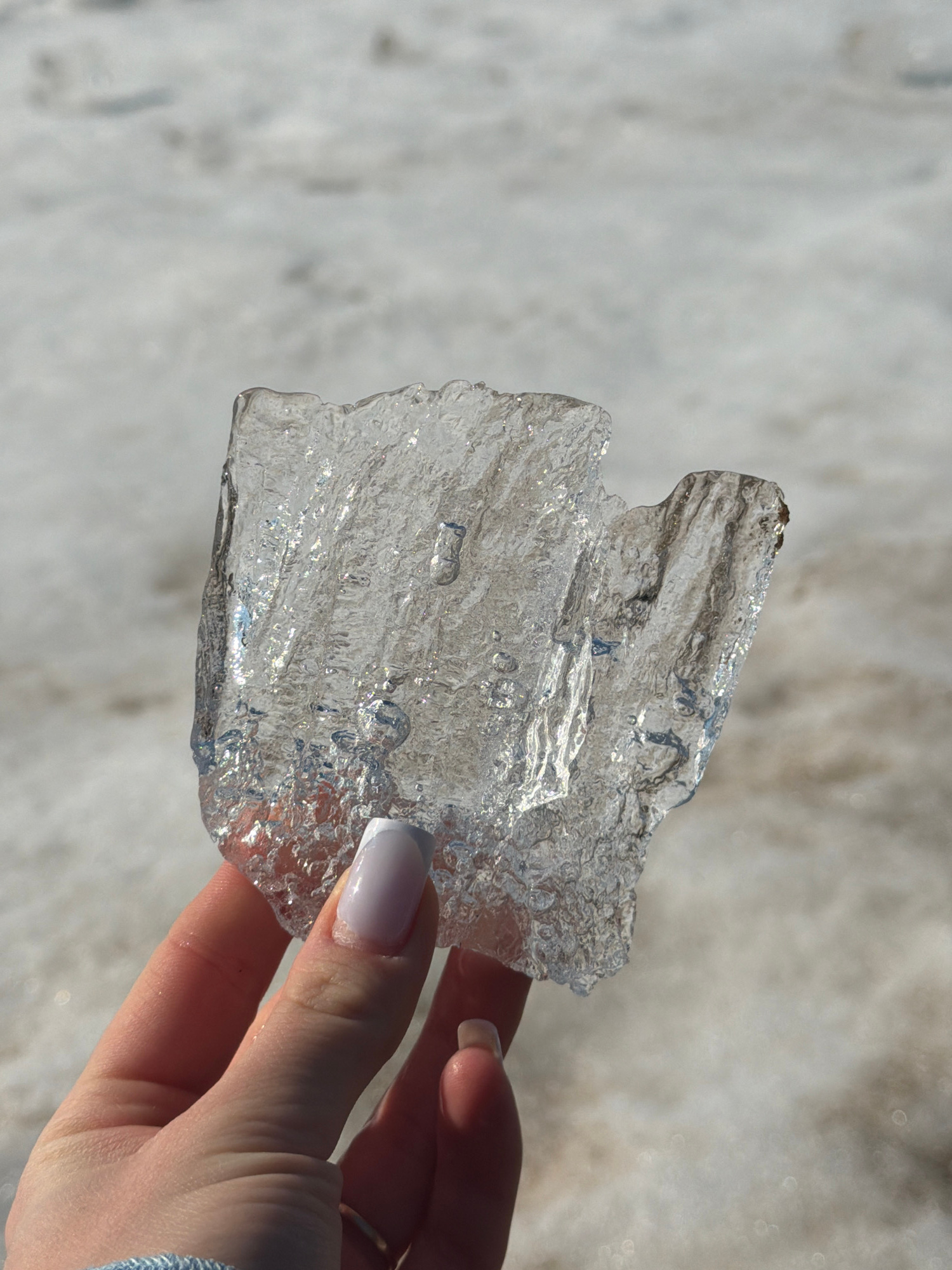 A person is holding a piece of clear ice in their right hand. The ice is roughly square with uneven edges and internal refractions. The person's fingers are visible, with a pale manicure on the nail o…read more