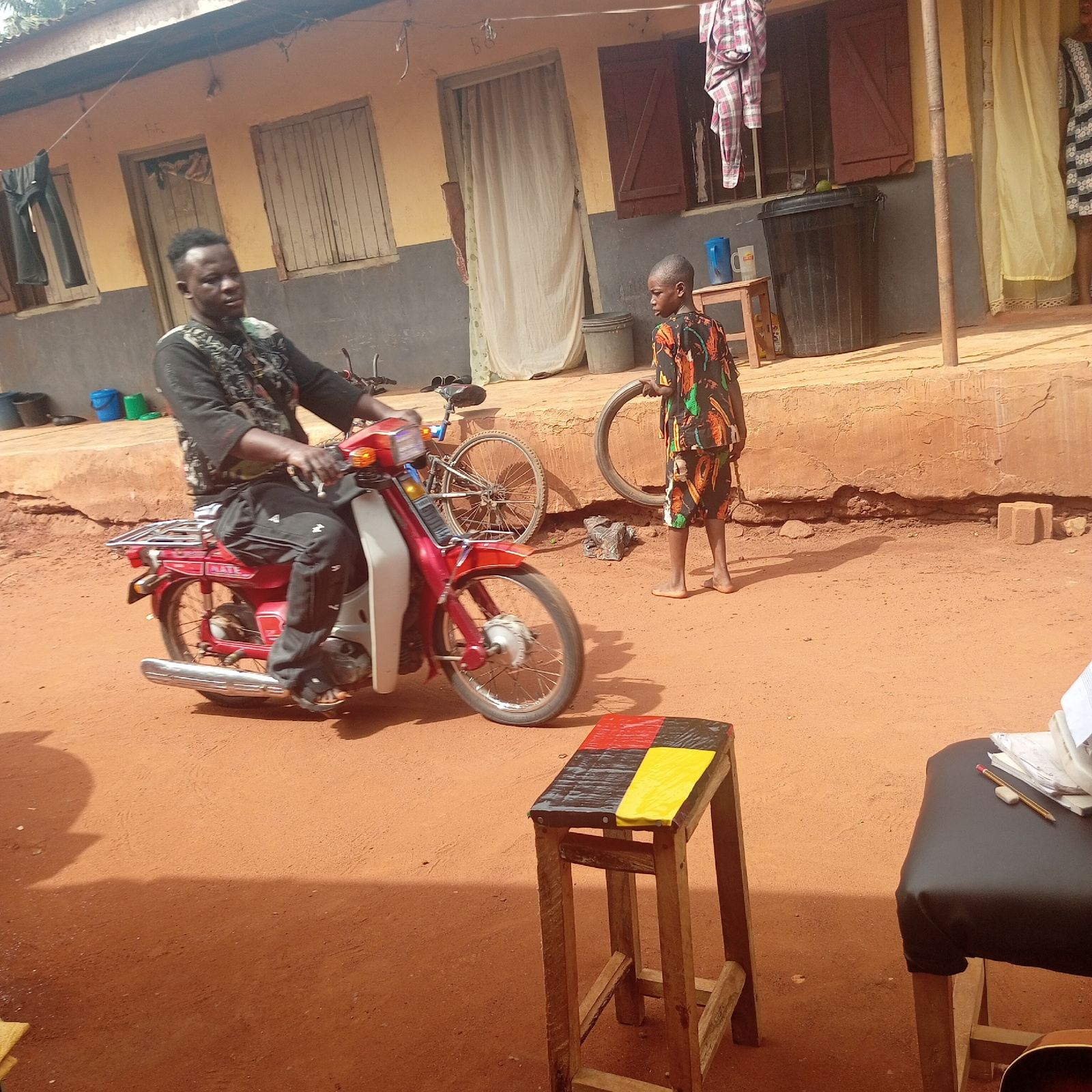 The image shows a street scene in Nsukka, Nigeria, recognizable by the red soil and architecture. A man is riding a red Honda motorcycle on the unpaved road. A boy stands nearby holding a bicycle whee…read more