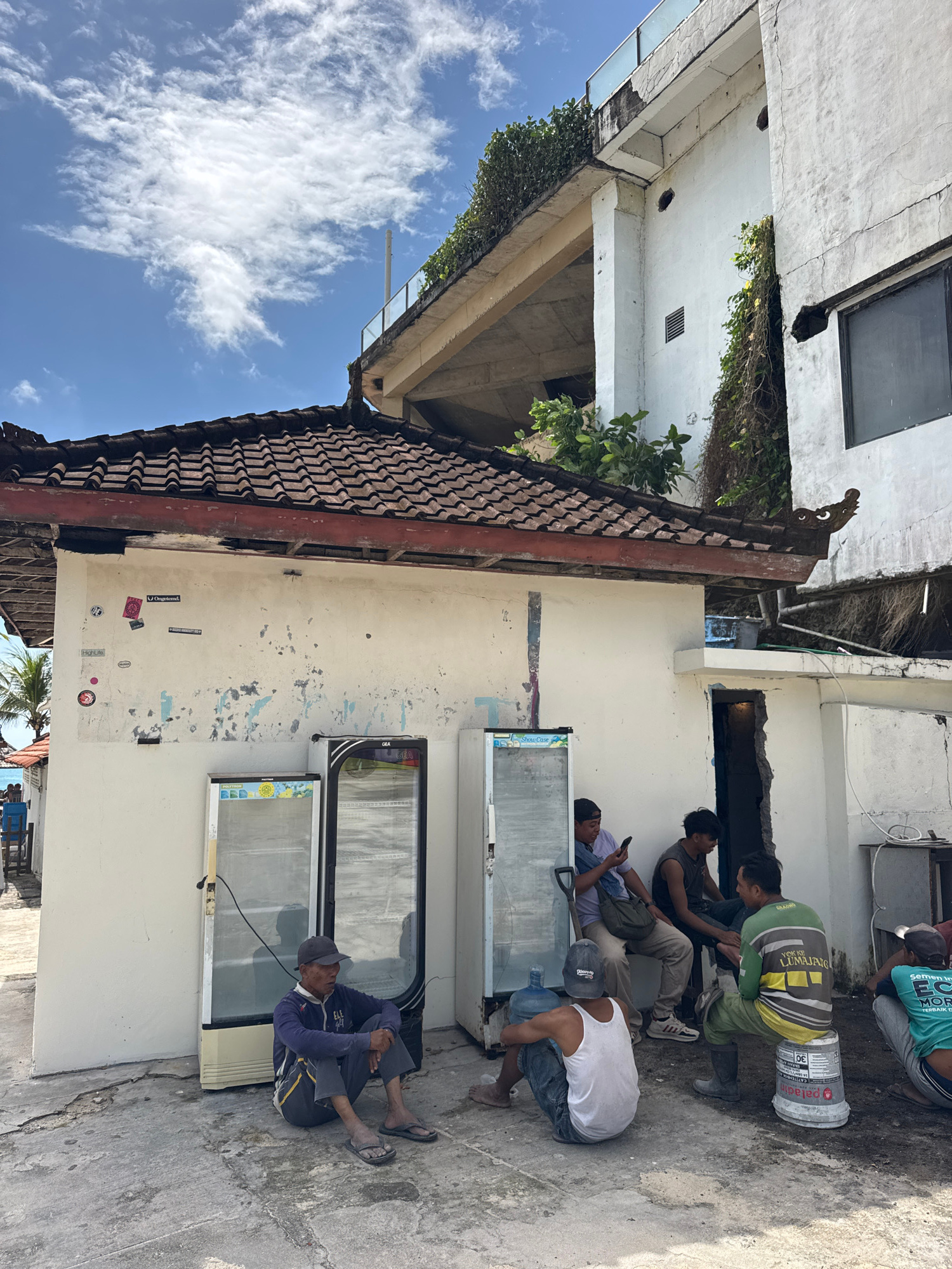 The image shows an outdoor scene in Kuta Selatan, Indonesia. Several construction workers are resting near a white building. The building has two large windows or display cases and peeling paint. Sticβ¦read more
