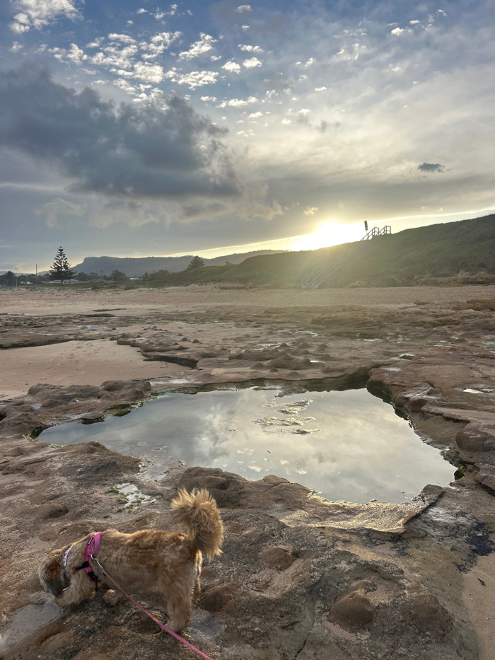 This image depicts a coastal scene in Bulli, Australia, characterized by a rocky foreshore and sandy beach under a partially cloudy sky with the sun low on the horizon. In the immediate foreground, a…read more