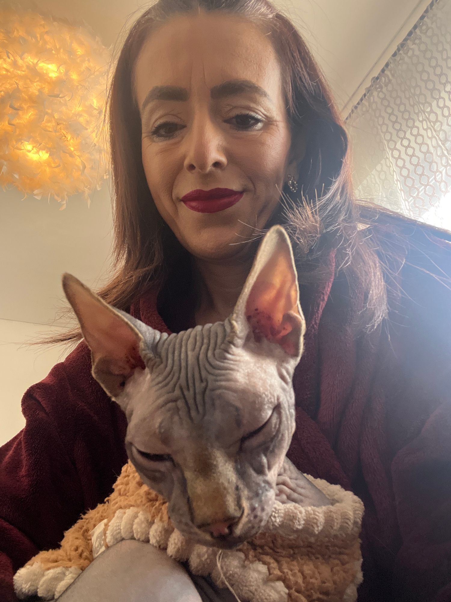 A woman is holding a Sphynx cat in her arms. The woman has brown hair and is wearing red lipstick. The cat is hairless with wrinkled skin. They appear to be indoors. In the background, there is a lamp…read more