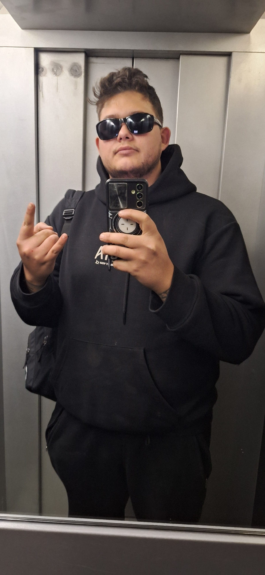 A man is taking a selfie in what appears to be an elevator. The man is wearing dark sunglasses and a black hooded sweatshirt. He is holding a smartphone in his right hand. The phone has a broken scree…read more