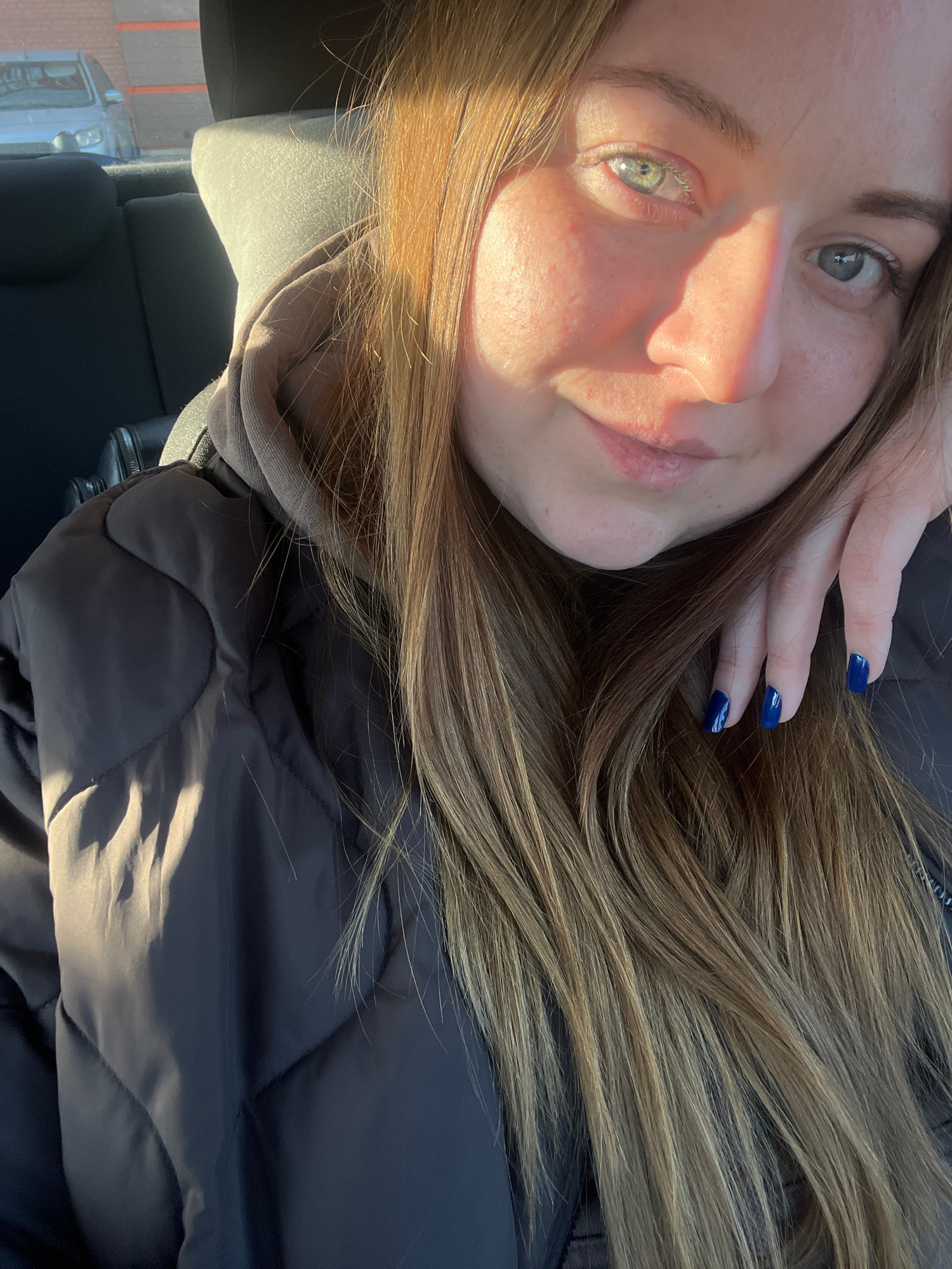 A portrait-oriented photo captures a young woman inside a vehicle, likely taking a selfie, in Klin, Russia. She has long, light brown hair that cascades around her shoulders. Her face, turned towardsβ¦read more