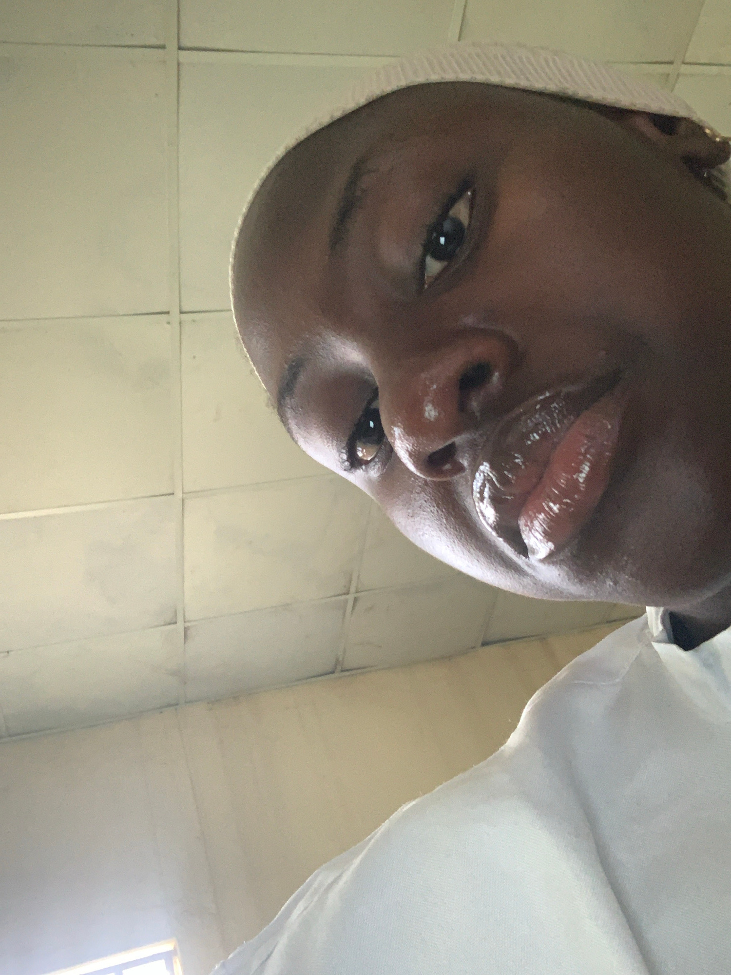 A close-up, inverted selfie shows a dark-skinned person with a head covering, possibly a surgical cap, and a white garment visible on the right side. Their lips appear glossy. The background consists…read more