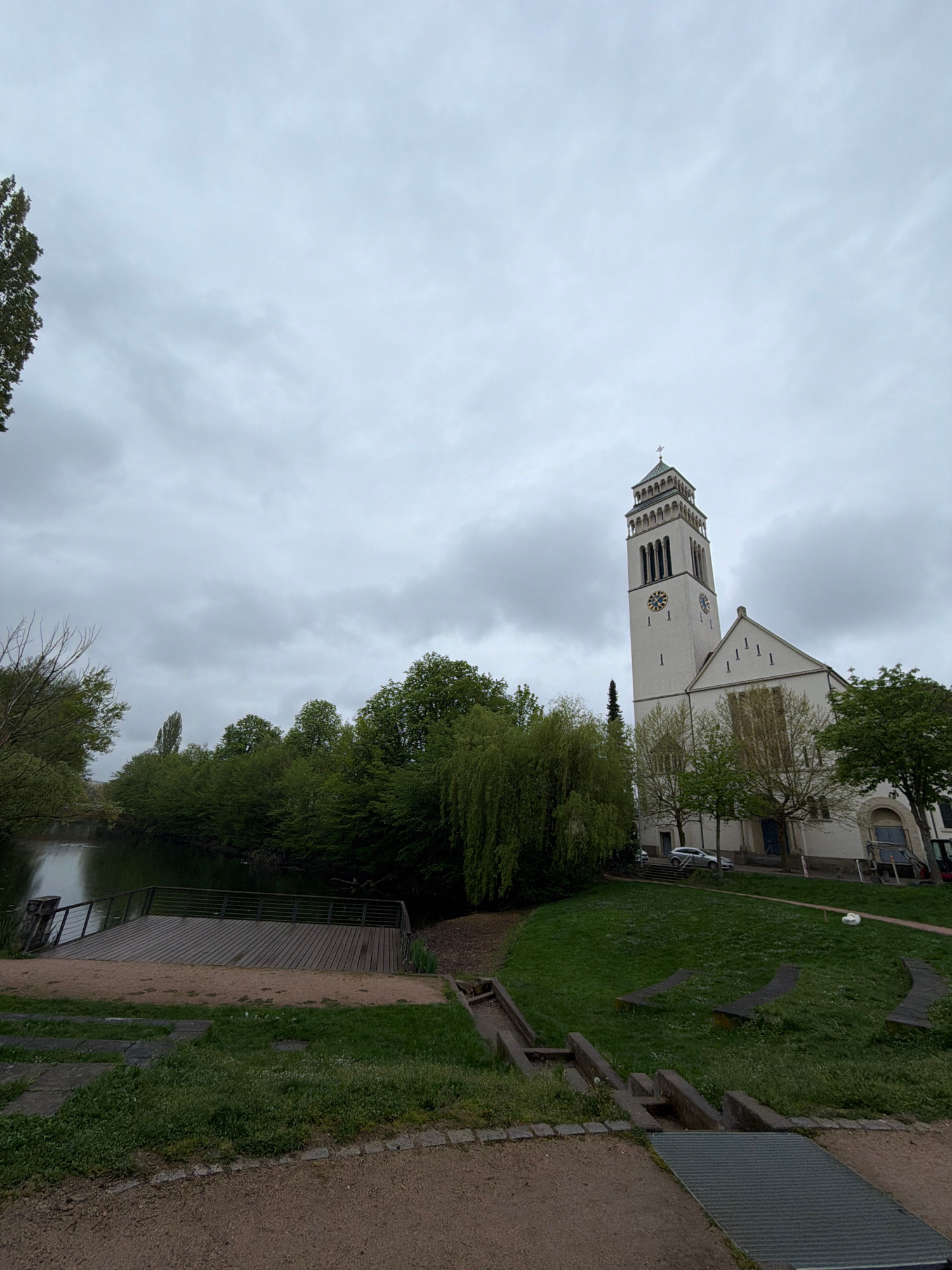 The image shows St. Johannes Nepomuk Church in Kehl, Germany, viewed from a waterside perspective. The church, a tall, white structure with a prominent clock tower, stands against a cloudy sky. Lush g…read more