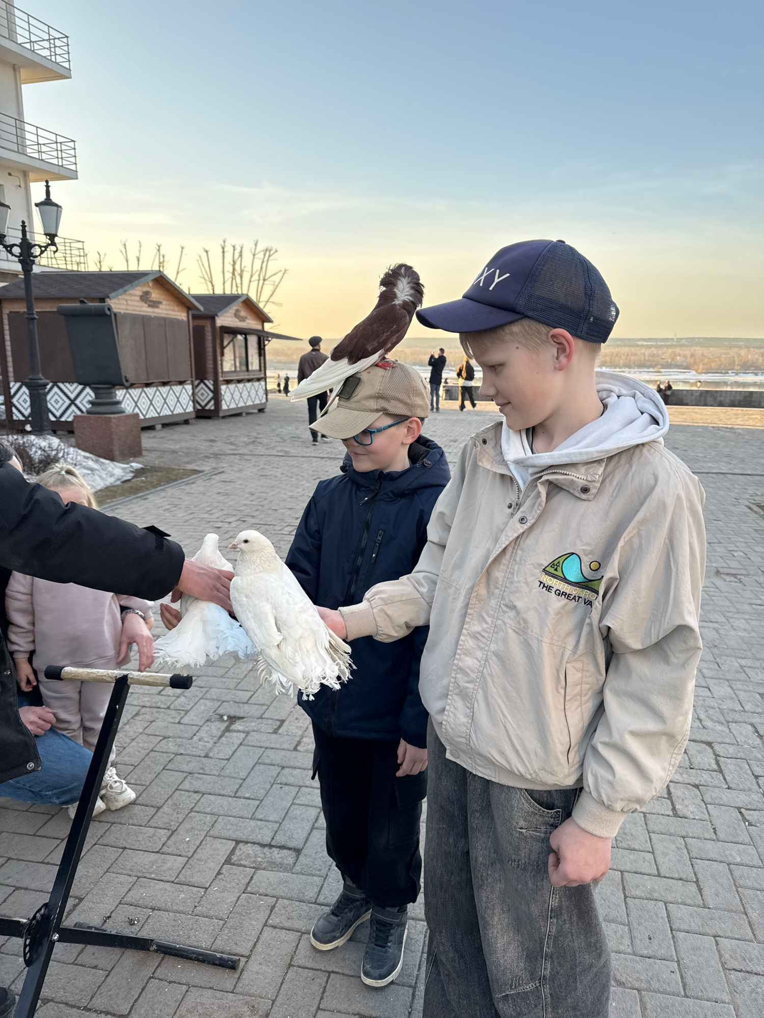 Two boys stand on a paved walkway, looking at white doves being held by someone whose lower half is visible. The older boy wears a light jacket, gray hoodie, and a navy cap. The younger boy wears a na…read more