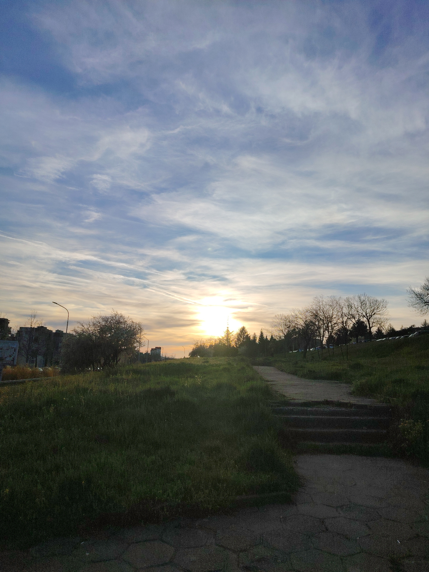 The image depicts a landscape at dusk or dawn in what appears to be a park or green area within a city. The sky is filled with layered clouds illuminated by a bright light source, presumably the sun,…read more