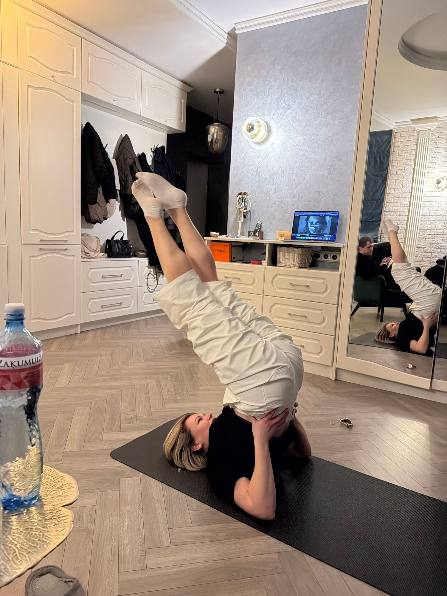 A woman in a black top and white shorts is performing a yoga pose on a black mat. Her feet are pointed towards the ceiling and her hands are supporting her head. The environment appears to be an apart…read more