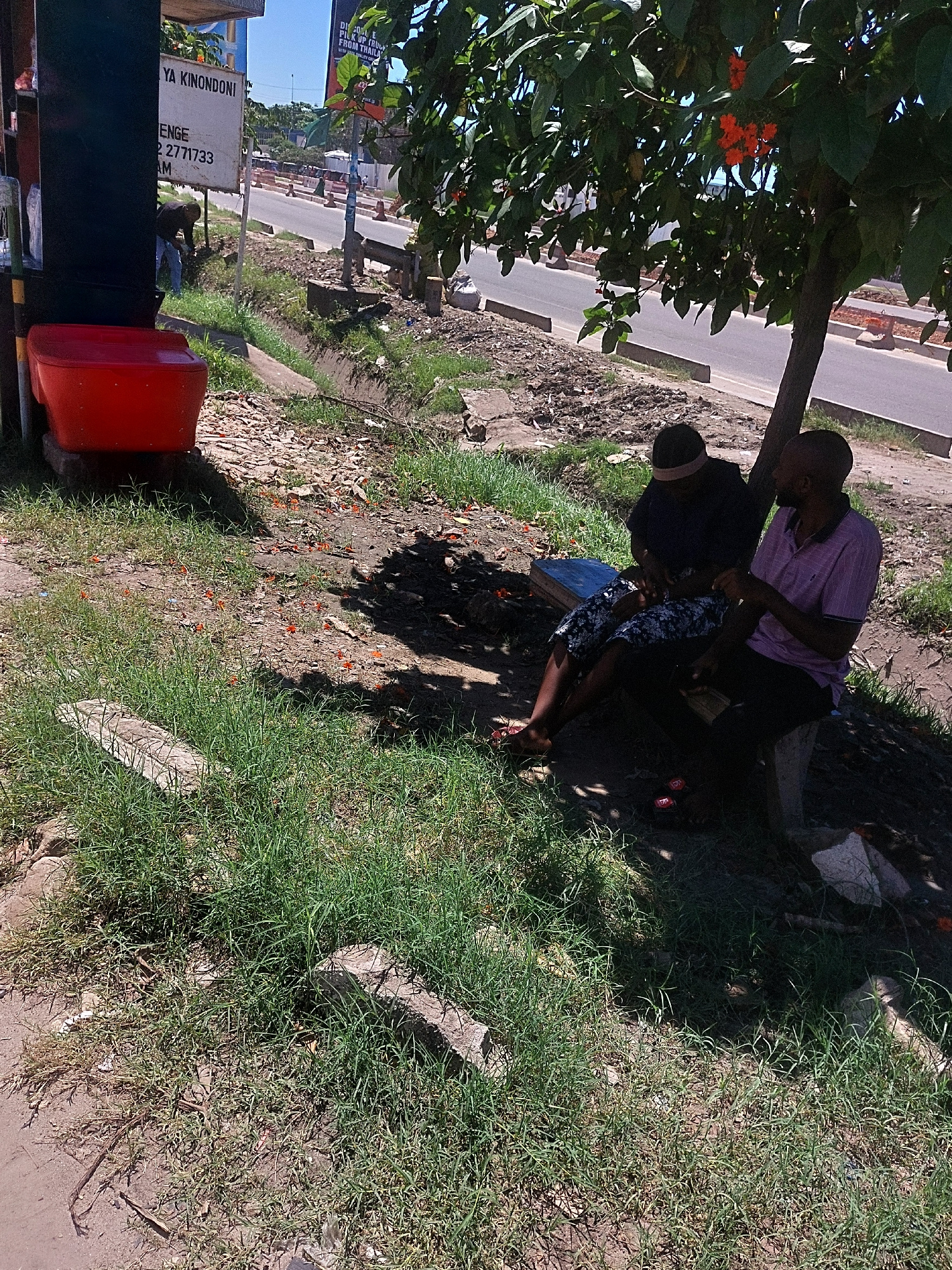 The image shows two people sitting on a bench under a tree. One person is wearing a pink striped shirt, and the other is wearing a darker shirt with a patterned dress. The scene appears to be a street…read more