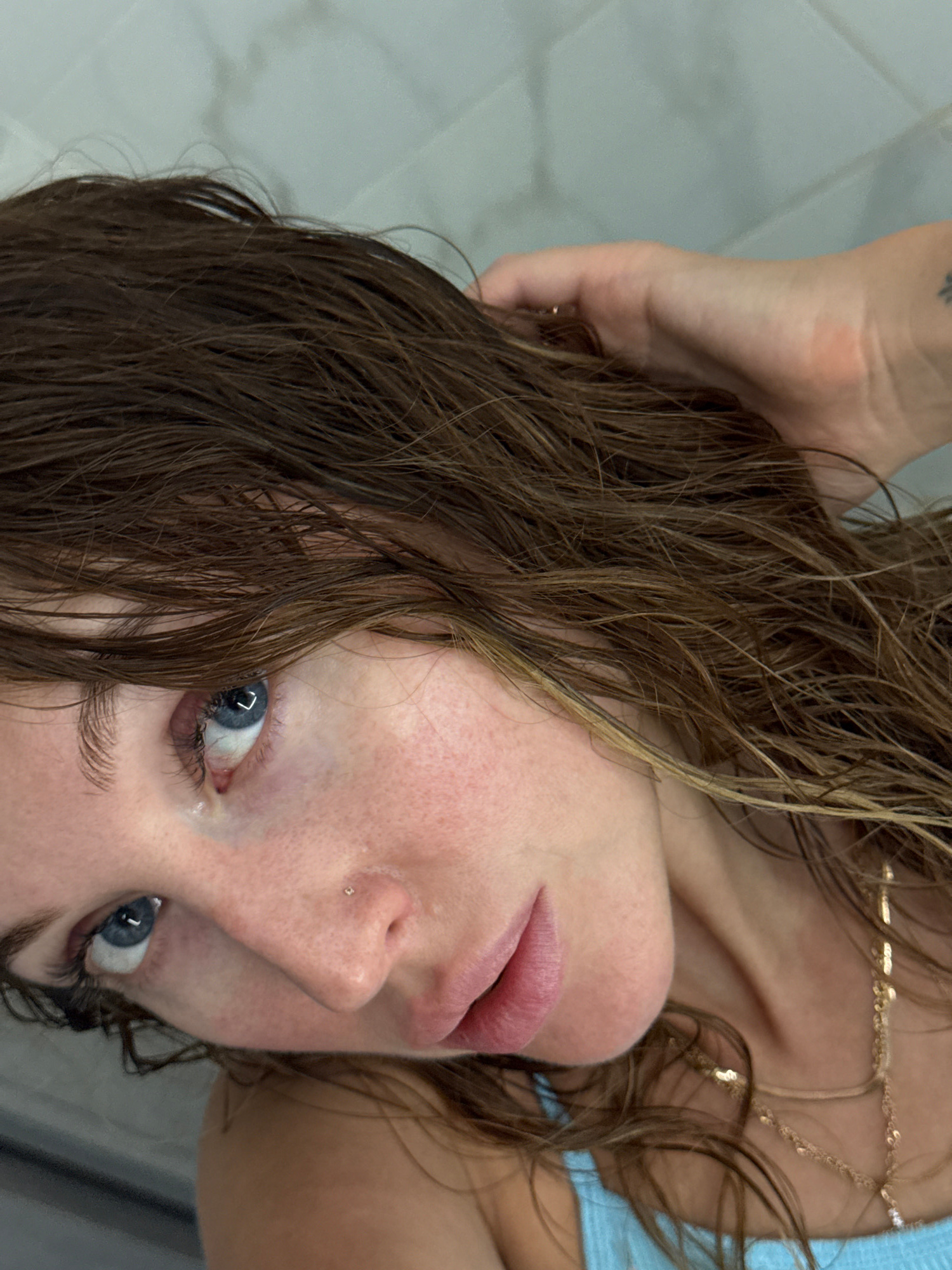 A close-up, inverted portrait features a young woman with wet, brown hair, looking directly into the camera. Her face is positioned upside down, with her blue eyes gazing upwards. Her light-toned skin…read more