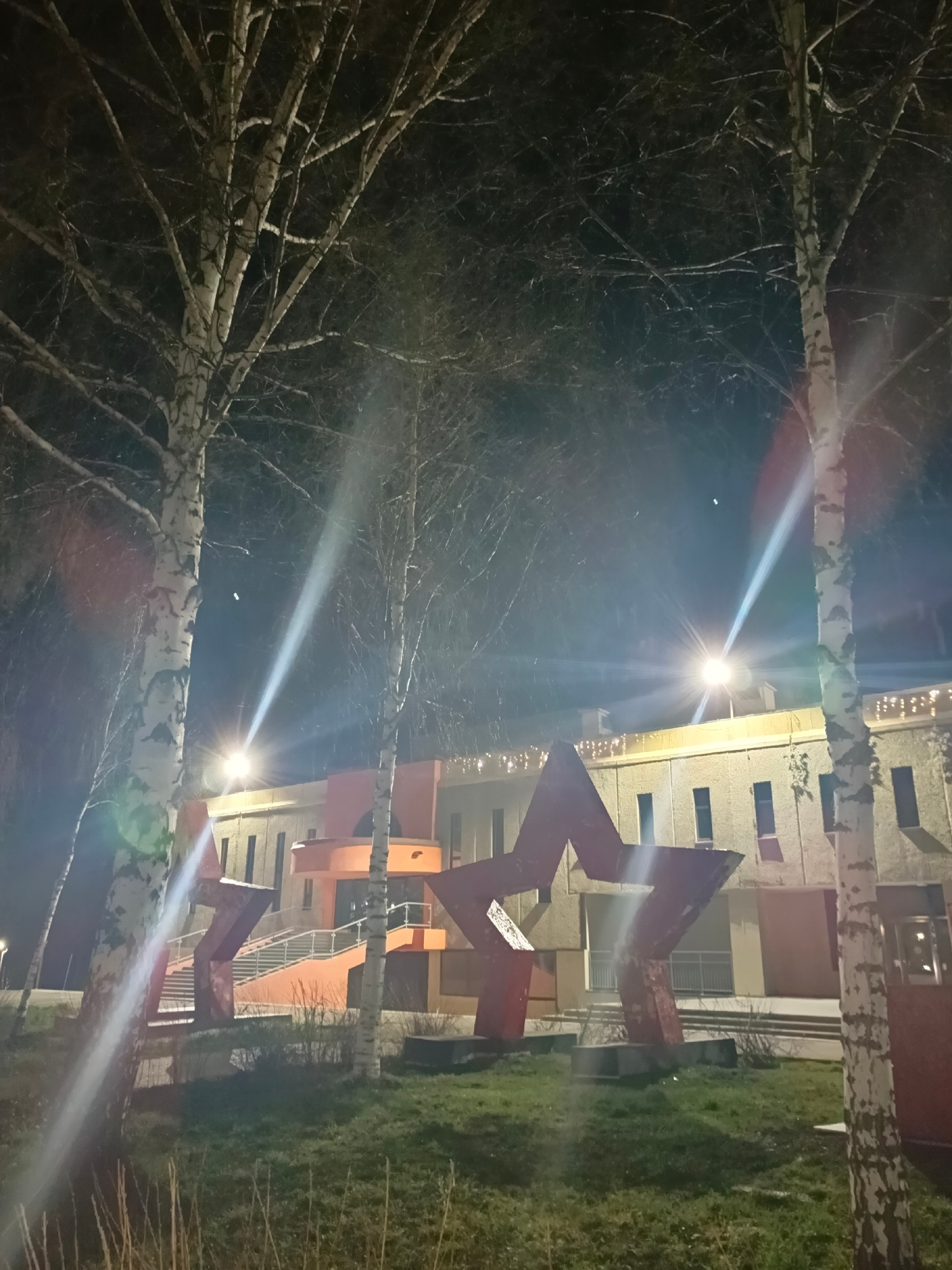 The image presents an outdoor night scene in Markovskii, Russia, featuring a building and prominent sculptures, framed by trees. In the foreground and mid-ground, several birch trees with characteris…read more