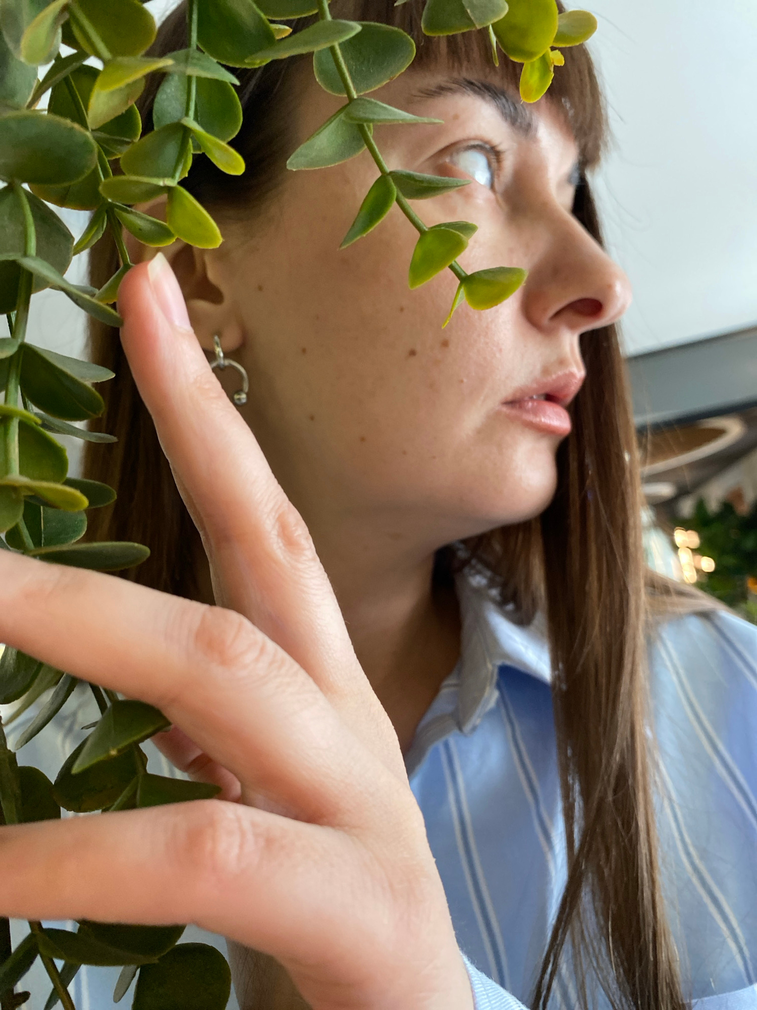 This close-up image features a person, likely a young female, in an artistic and contemplative pose indoors. The subject is depicted in profile, with their head tilted back and gaze directed upwards o…read more