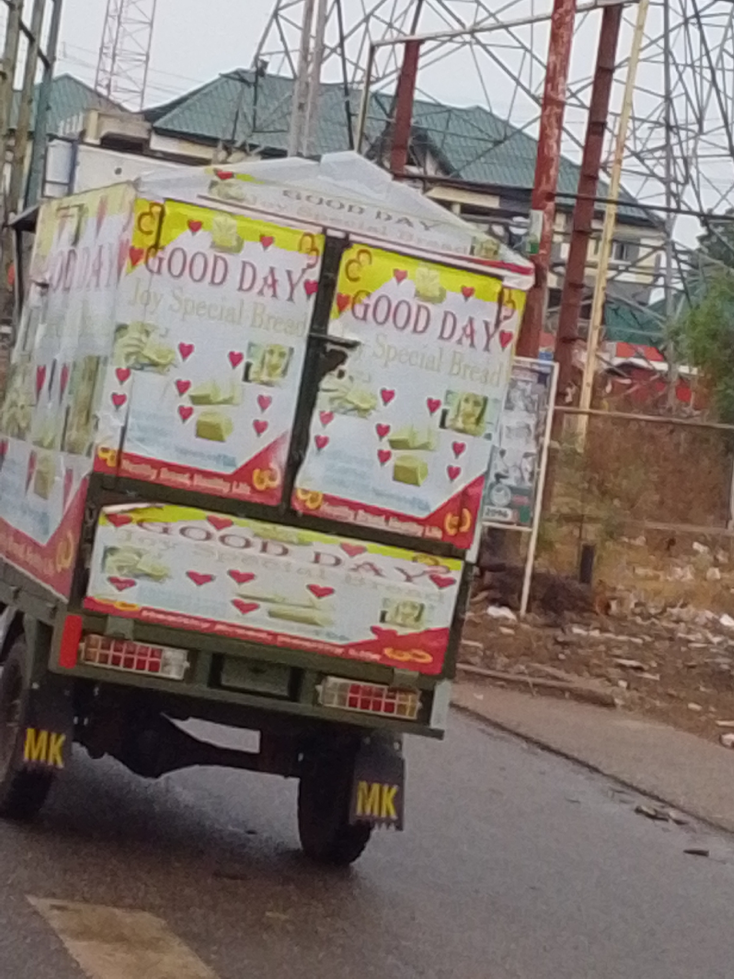 A small truck with a boxy cargo bed covered in advertisements for "GOOD DAY Joy Special Bread" travels on a paved road. The letters "MK" are visible on the mud flaps behind the rear tires. Overhead, u…read more