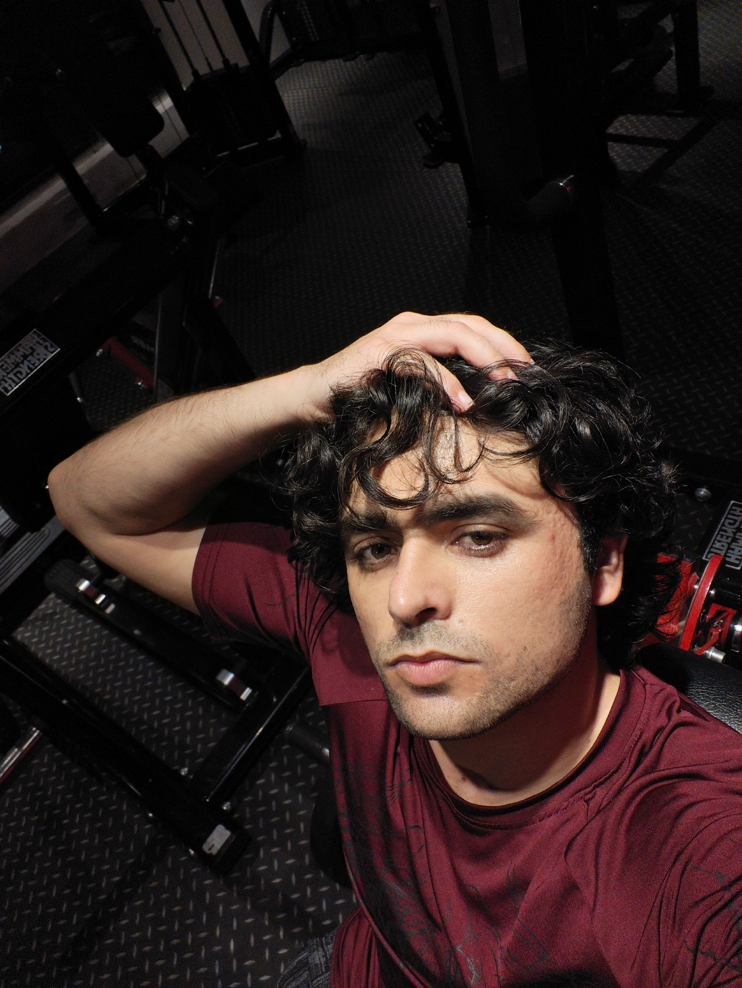 A man is pictured in what appears to be a gym. He has dark, curly hair and is wearing a maroon t-shirt. His right arm is raised, with his hand touching his head. The background features exercise equip…read more