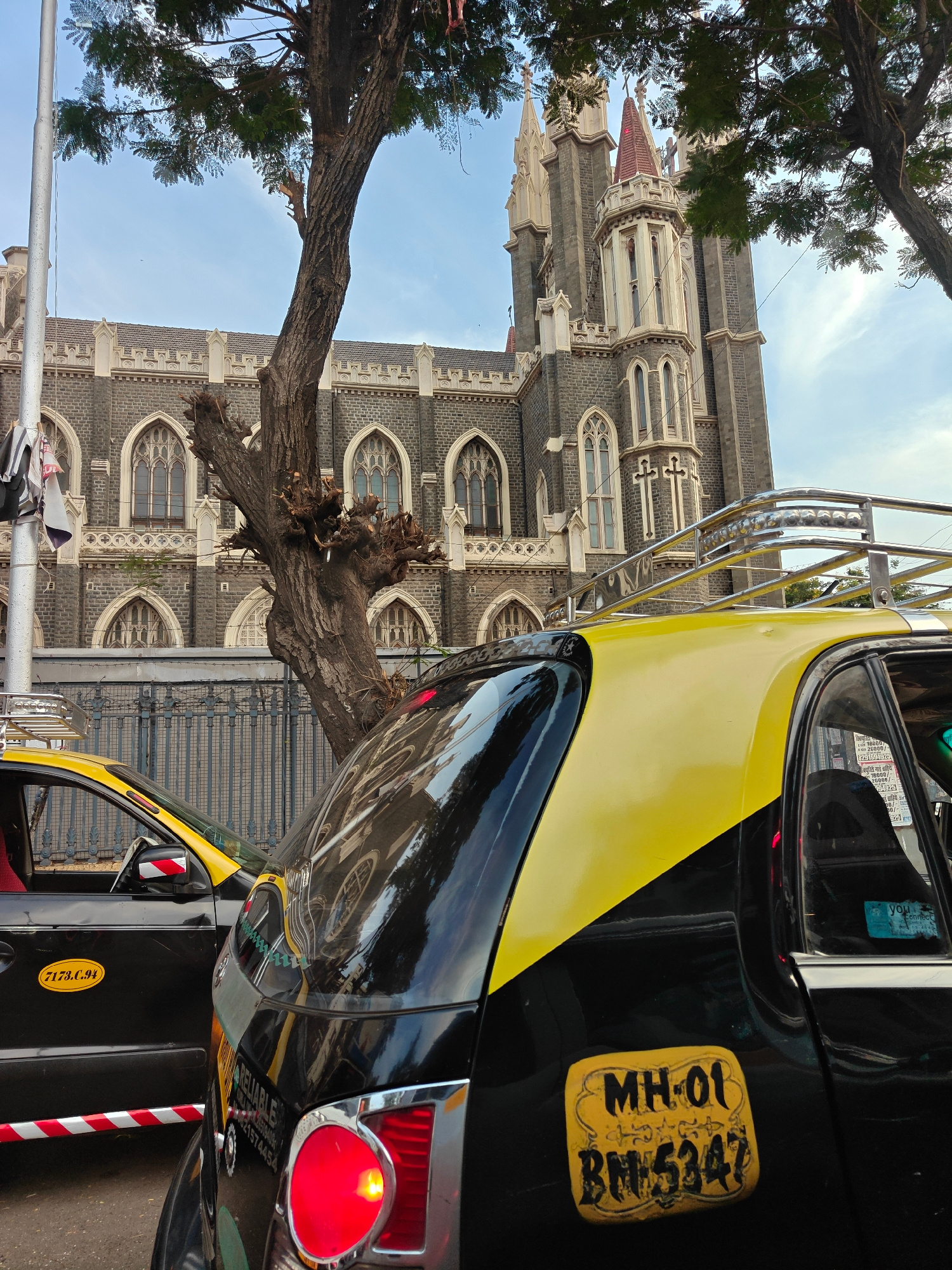 This vertical, eye-level shot captures a vibrant street scene in Mumbai, India, juxtaposing historic architecture with modern urban transport. In the foreground, a large, gnarled tree with dense folia…read more