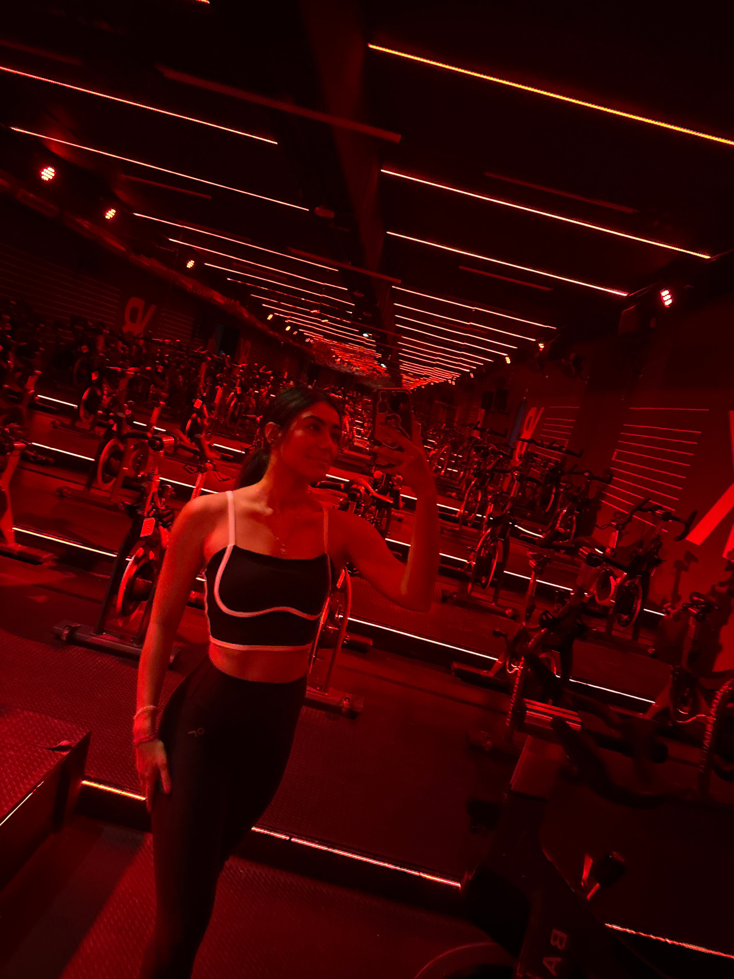 A long, narrow room illuminated by red light appears to be a spinning class studio. Rows of stationary bikes extend into the distance, with a woman standing in the foreground. She is wearing a black a…read more