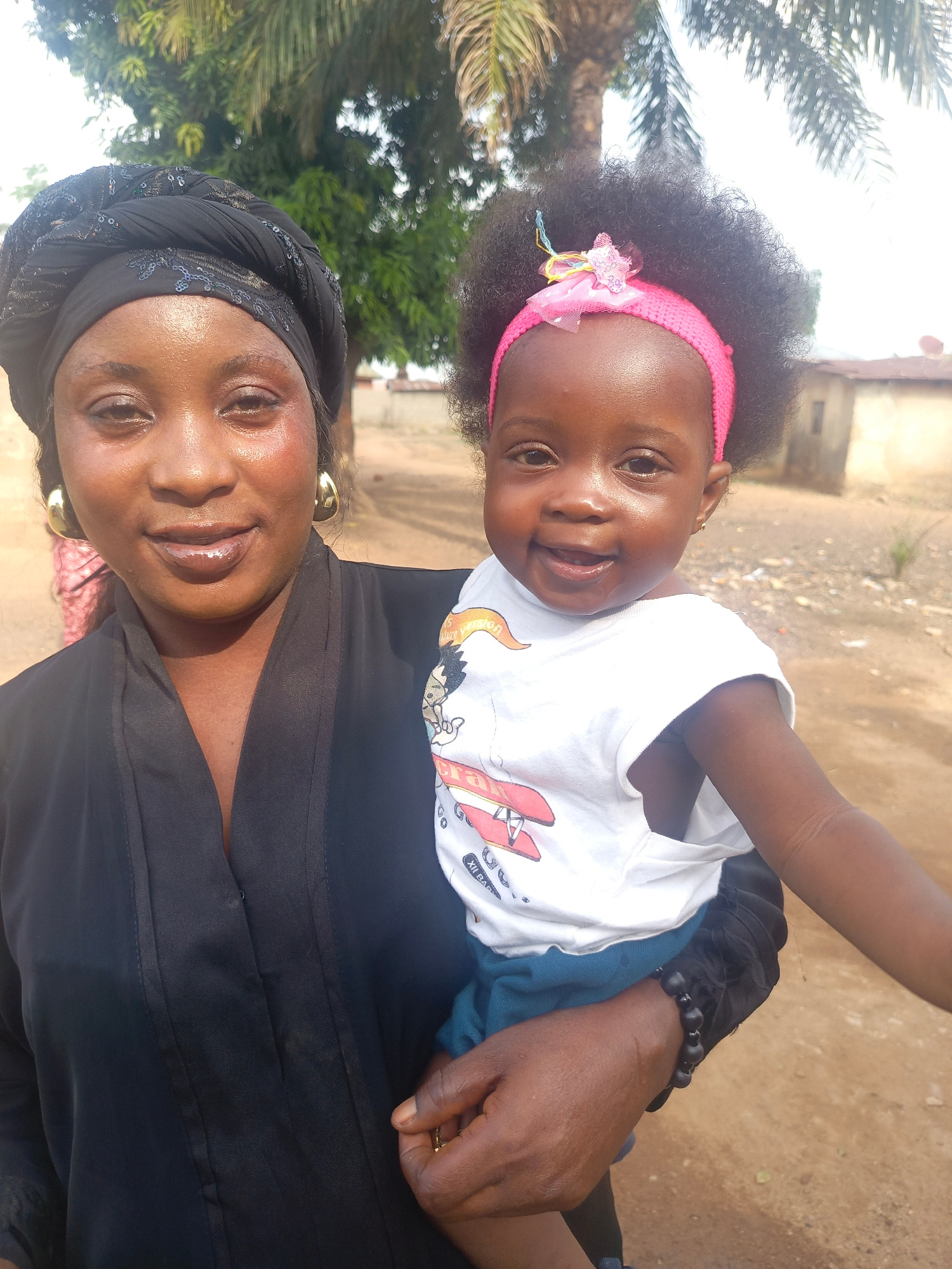 The image shows a woman holding a young child in an outdoor setting. The woman is wearing a black head covering and a dark-colored robe. She has gold hoop earrings. The child is wearing a pink headban…read more