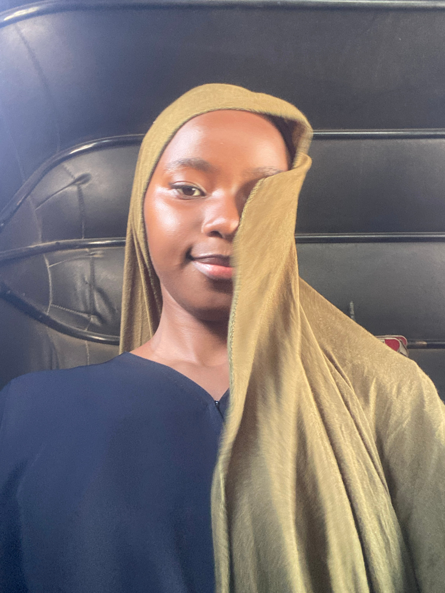 A person wearing a gold-colored headscarf and a navy blue shirt is seated in what appears to be a bus or vehicle interior. The seat behind the person has a black leather or leatherette upholstery. The…read more