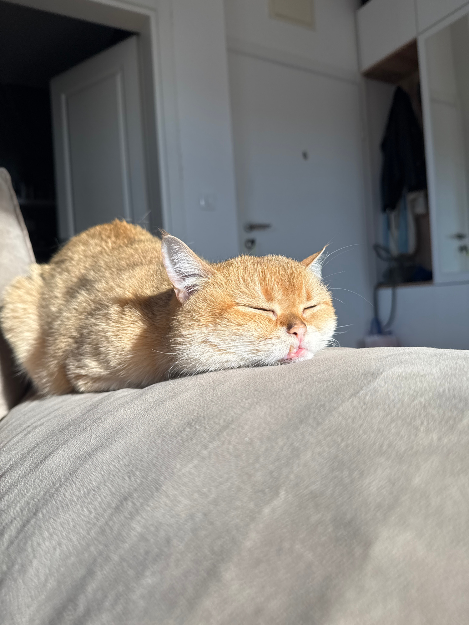 A medium shot captures a light orange cat with its eyes closed, face pressed against a gray fabric, likely part of a piece of furniture. The cat's ear is visible, and sunlight illuminates the scene. T…read more