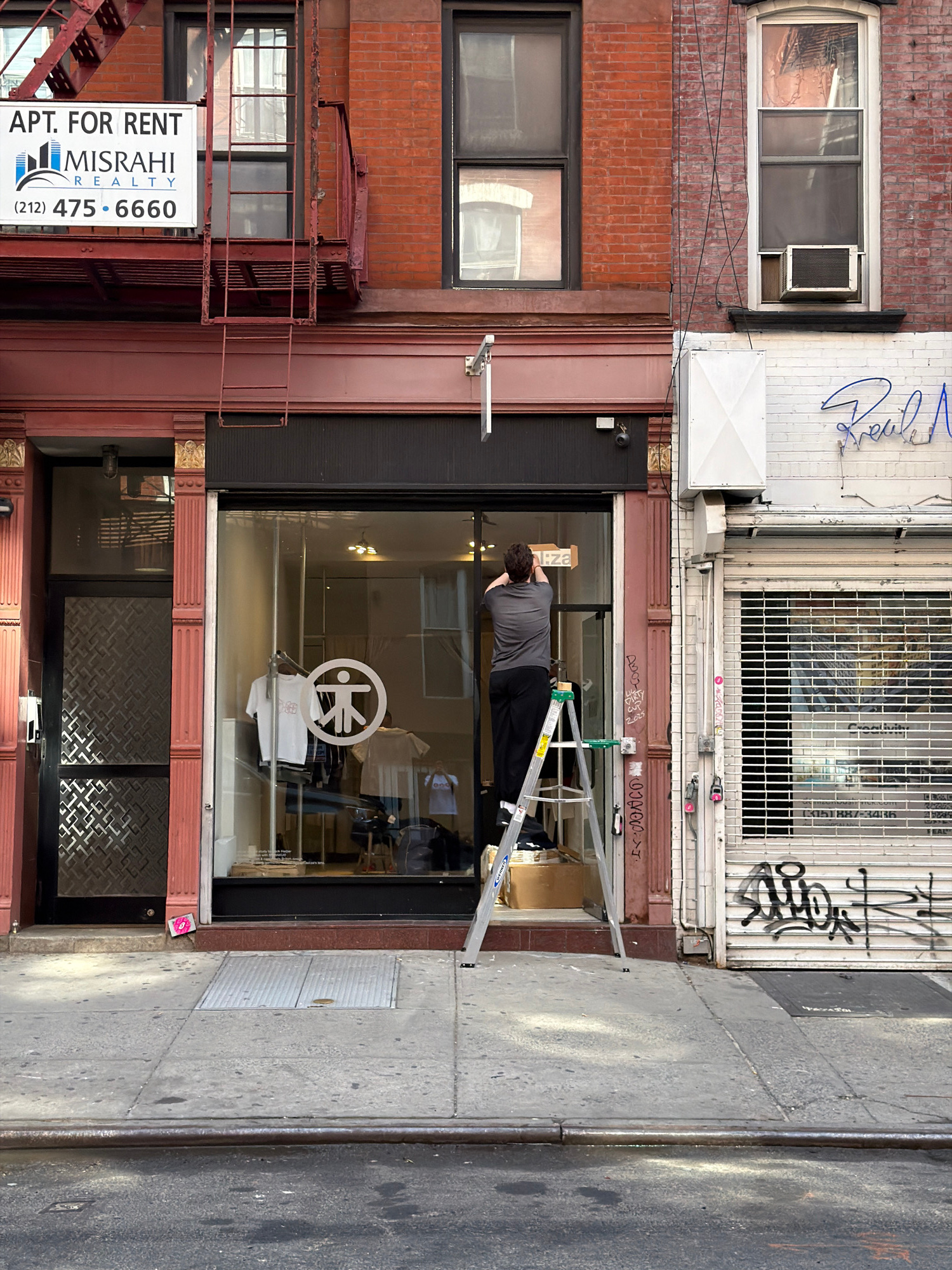 The image shows the facade of a building in New York City, United States. The building has a storefront with a large glass window. A man is inside the storefront, standing on a ladder and appearing to…read more