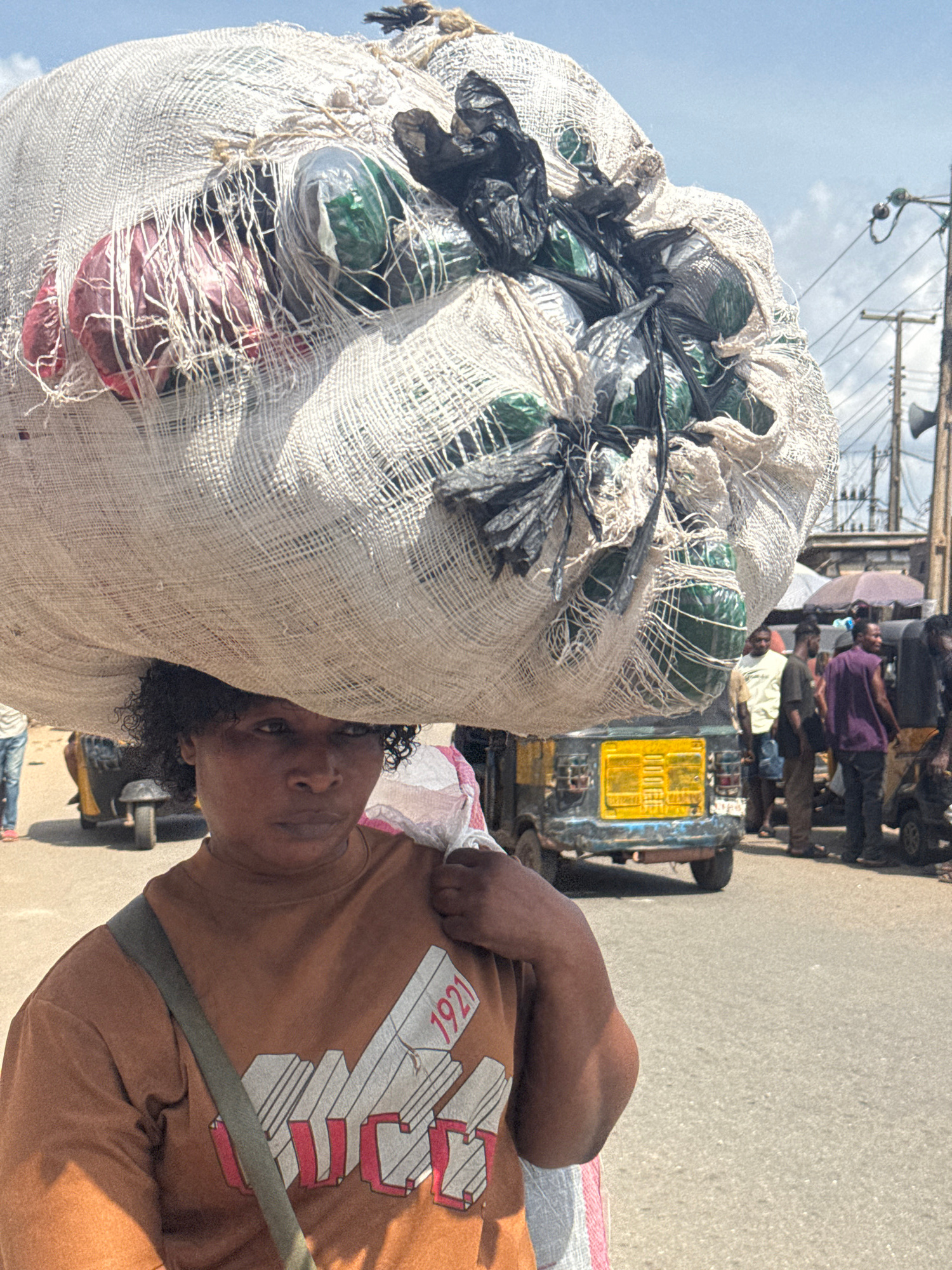 The image captures a vibrant street scene in Onitsha, Nigeria, centered on an individual carrying a large, heavy bundle on their head. The main subject, appearing to be a woman, is positioned towards…read more