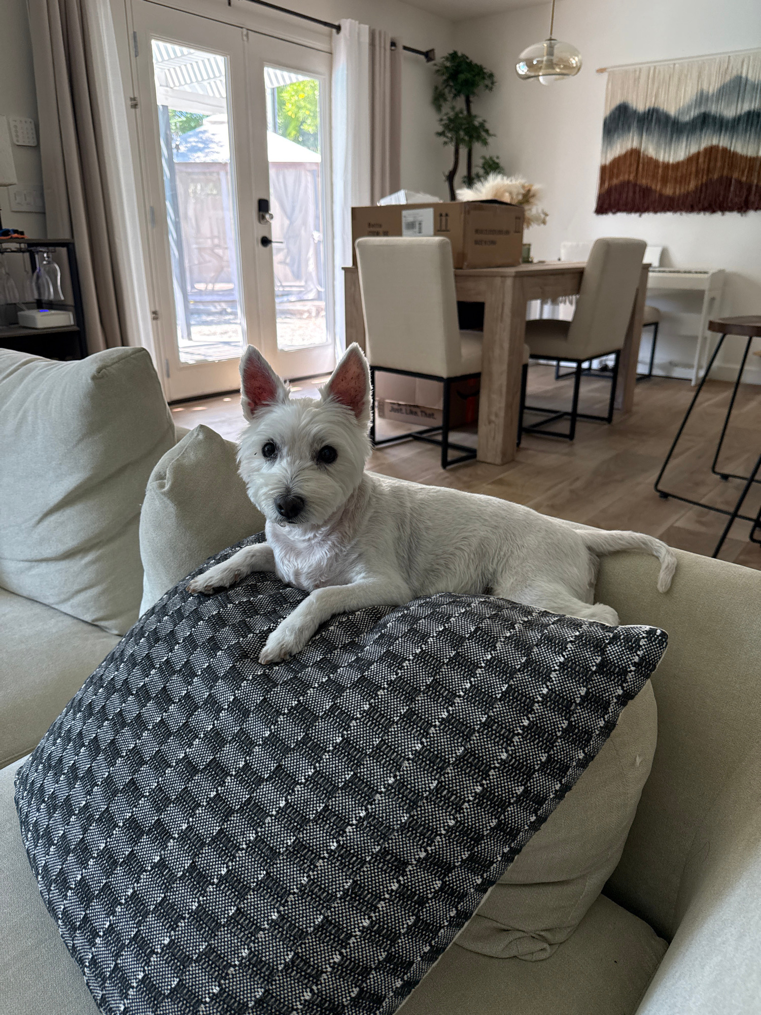 A white dog is resting on a couch with a black and white checkered pillow. The couch is light colored. The setting appears to be indoors, with a window in the background providing natural light. Outsi…read more