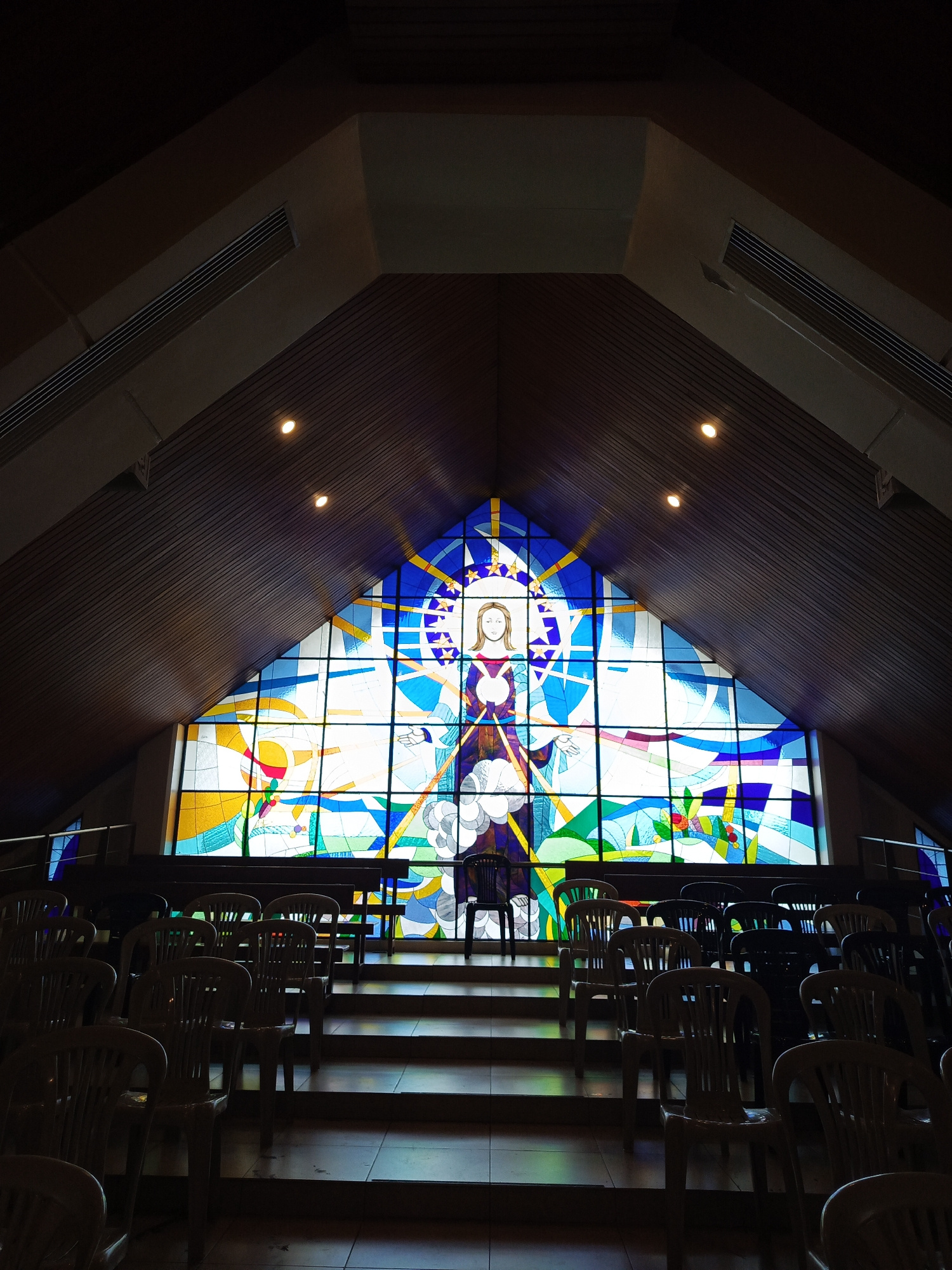 A low-angle interior shot of a church in Guayaquil, Ecuador, features a large, brightly colored stained-glass window depicting a woman surrounded by a blue halo. The window is triangular, fitting the…read more